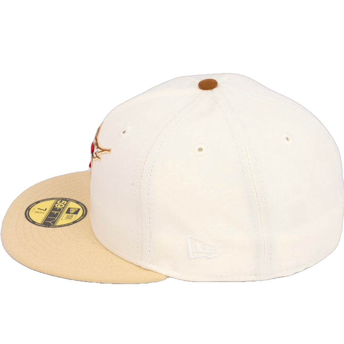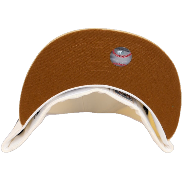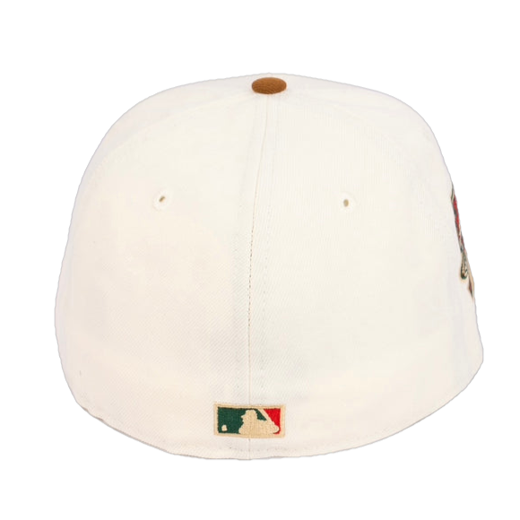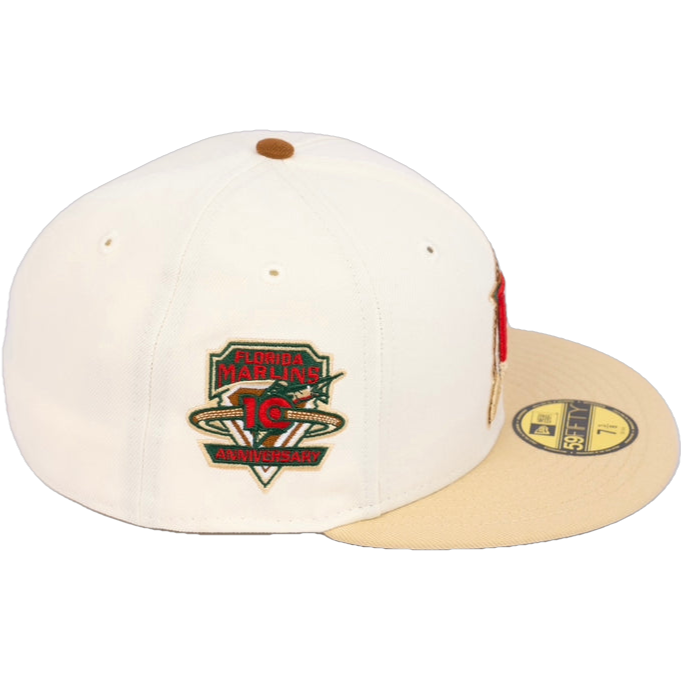 This New Era Florida Marlins 10th Anniversary 'Eggnog Pack' 59FIFTY Fitted Hat was released by Energie. The fitted has a chrome six panel structured high crown and embroidered eyelets with a toasted peanut fabric squatchee button. The fitted also has a vegas gold flat visor with a toasted peanut undervisor and white sweatband. The front panel features the Florida Marlins logo embroidered in toasted peanut, red and green stitching. The left panel of the fitted displays the New Era logo and the official MLB logo embroidery on the rear crown.