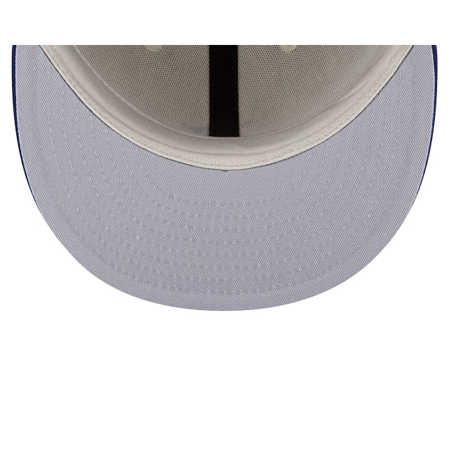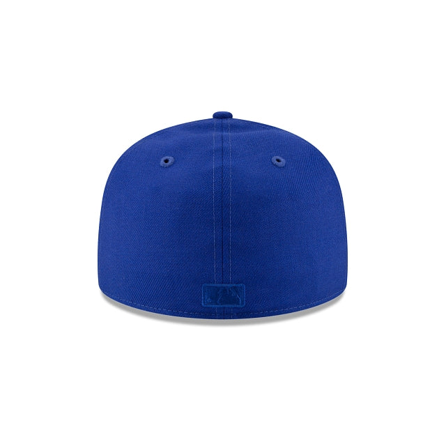 The Essentials By Fear of God Light Royal 59FIFTY Fitted Cap features an embroidered monochromatic Fear of God logo at the front panels, and a matching MLB Batterman logo at the rear. Additional details include a gray undervisor.