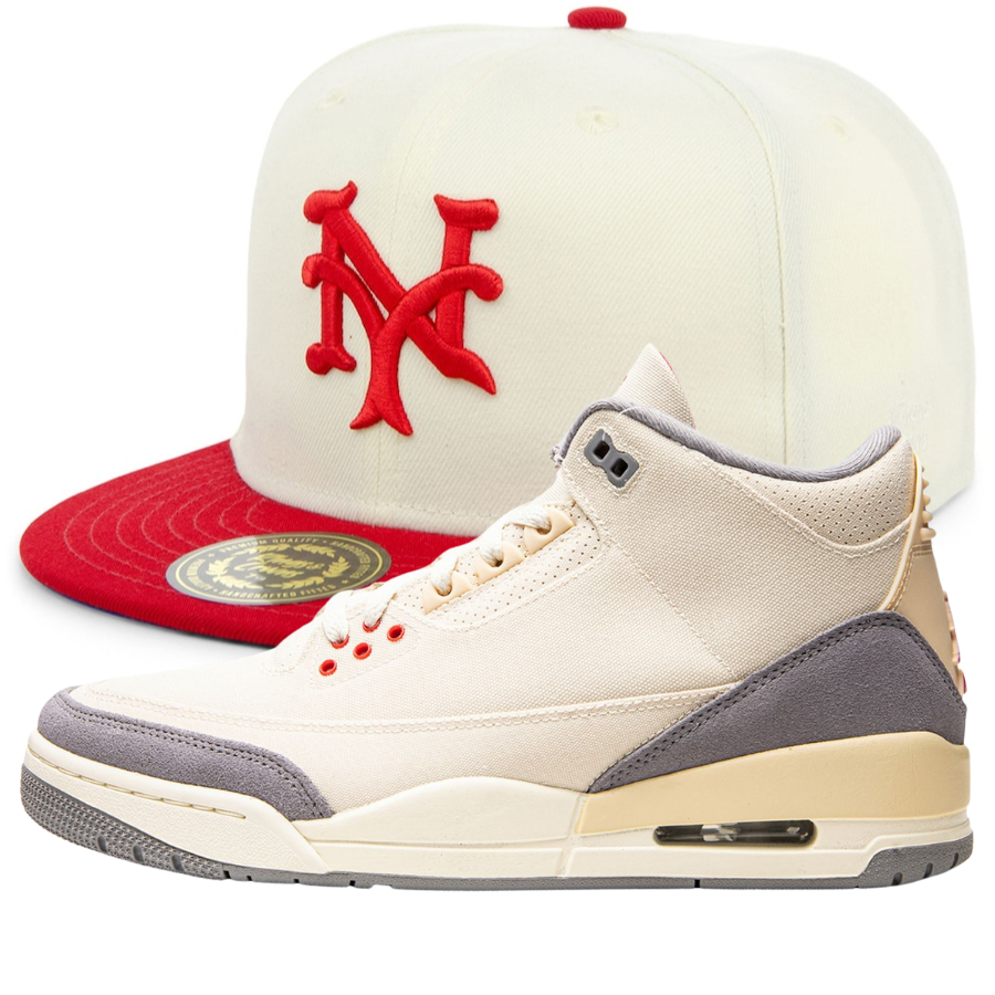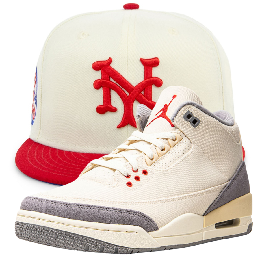 The Air Jordan 3 Muslin sneakers has a vintage look which goes well with the above New York Cubans Negro League fitted hat. The Air Jordan 3 Muslin has a muslin, cement grey suede and university red colorway. The sneaker, designed by Tinker Hatfield, is scheduled to be released on March 25th, 2022.
