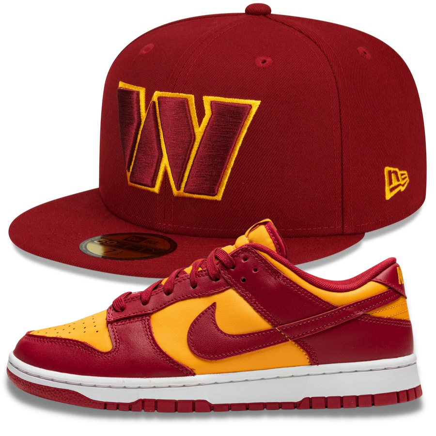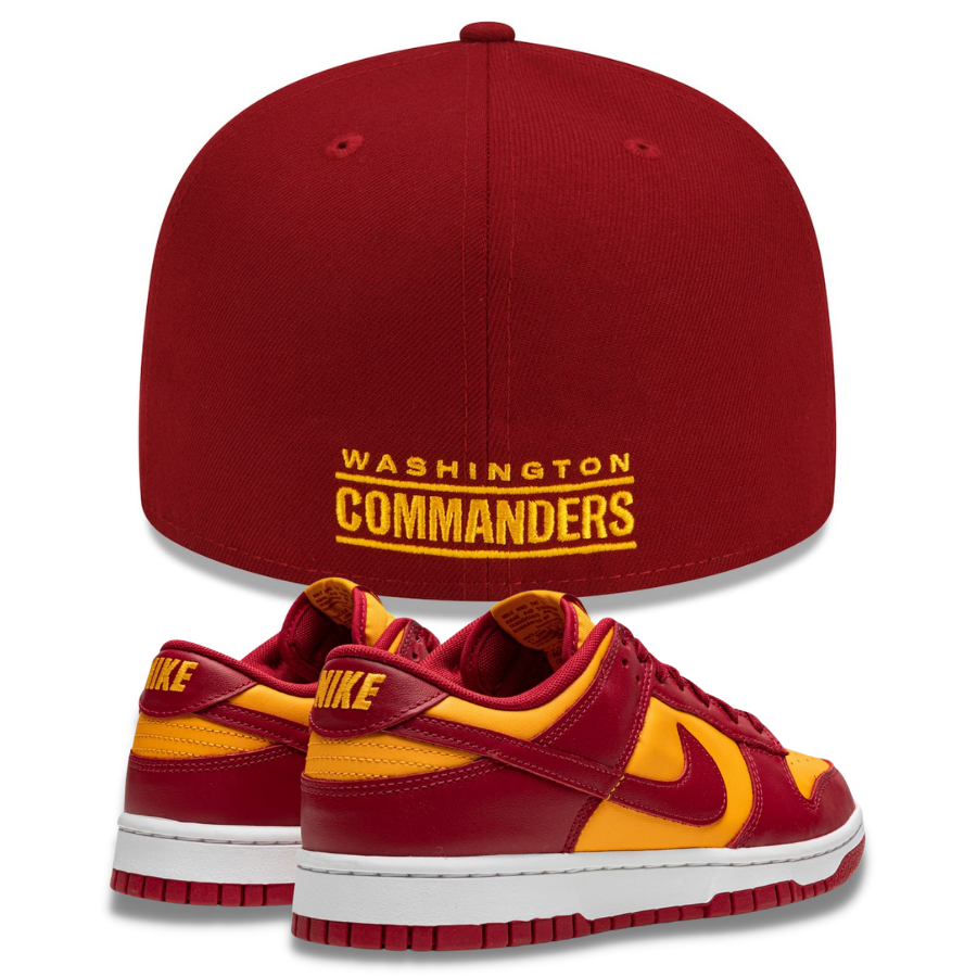 The New Era Washington Commanders burgundy and yellow colorway fitted hat matches perfectly with the Nike Dunk Low Retro "Midas Gold". Other burgundy and gold/yellow fitted hats can match with these sneakers as well but we decided to match them with the new NFL renamed team.