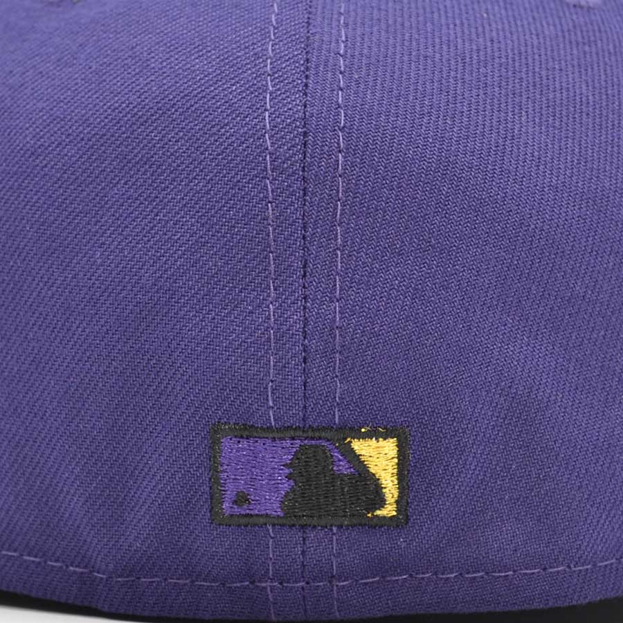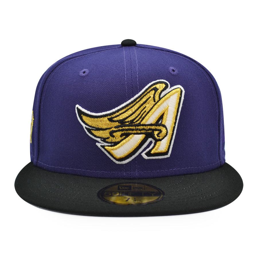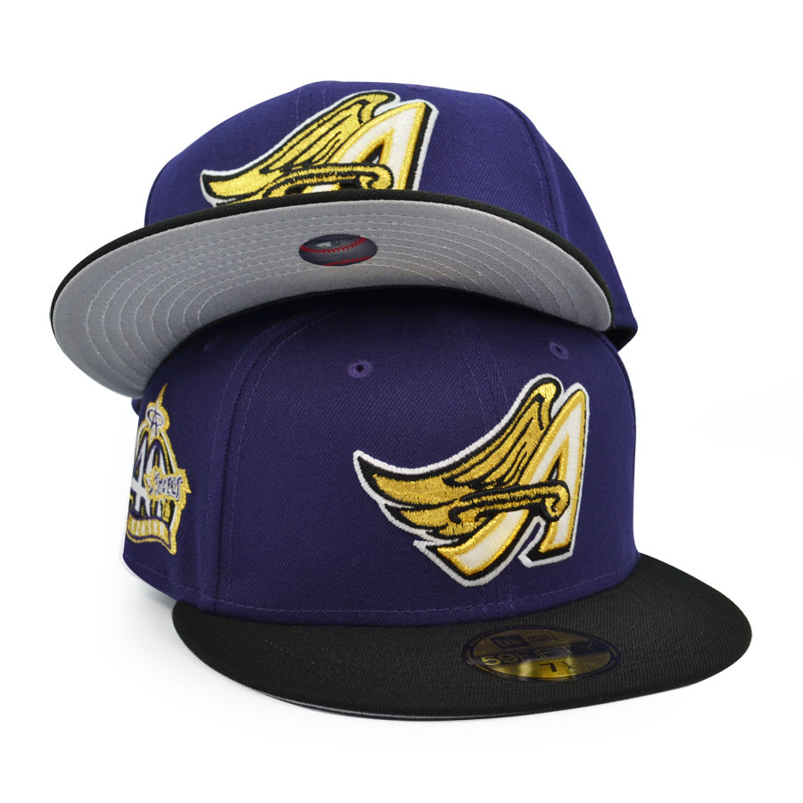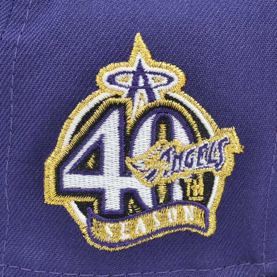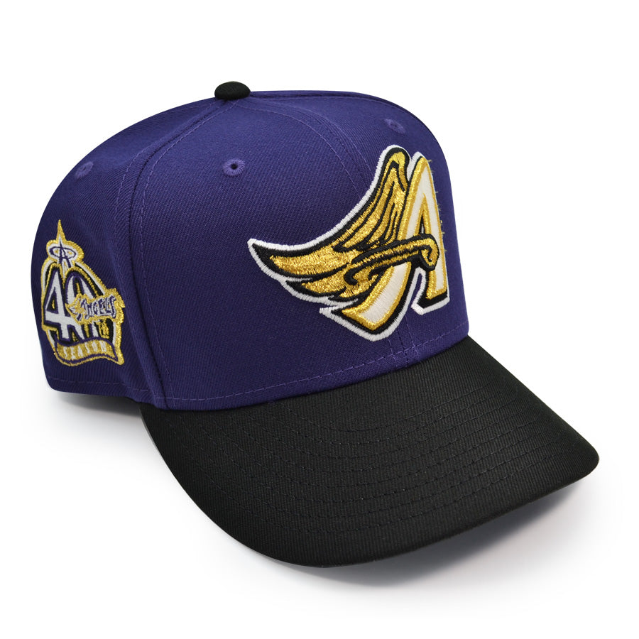 This Anaheim Angels fitted hat was released by Hat Dreams. The fitted has a purple six panel structured high crown and embroidered eyelets with a black fabric squatchee button. The flat bill of the cap is black with a gray bottom undervisor. The front panel features the Anaheim Angels logo embroidery and a 40th Anniversary side patch on the right panel. The left panel of the fitted displays the New Era logo and the official MLB Batterman logo embroidery on the rear crown.