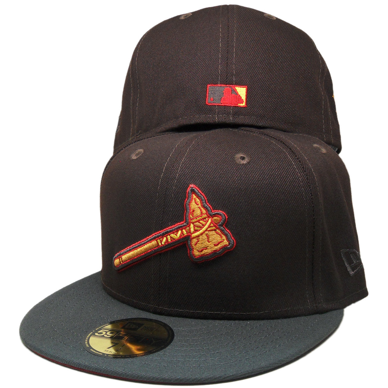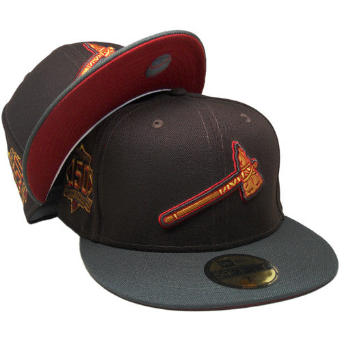 This New Era Atlanta Braves 59FIFTY fitted hat was released by Ecapsunlimited. The fitted has a dark brown six panel construction including embroidered eyelets and fabric squatchee button. The flat bill of the fitted is graphite with a burgundy undervisor and white sweatband. The front panel includes the Atlanta Braves Tomahawk logo embroidery and a 150th Anniversary side patch on the right panel.