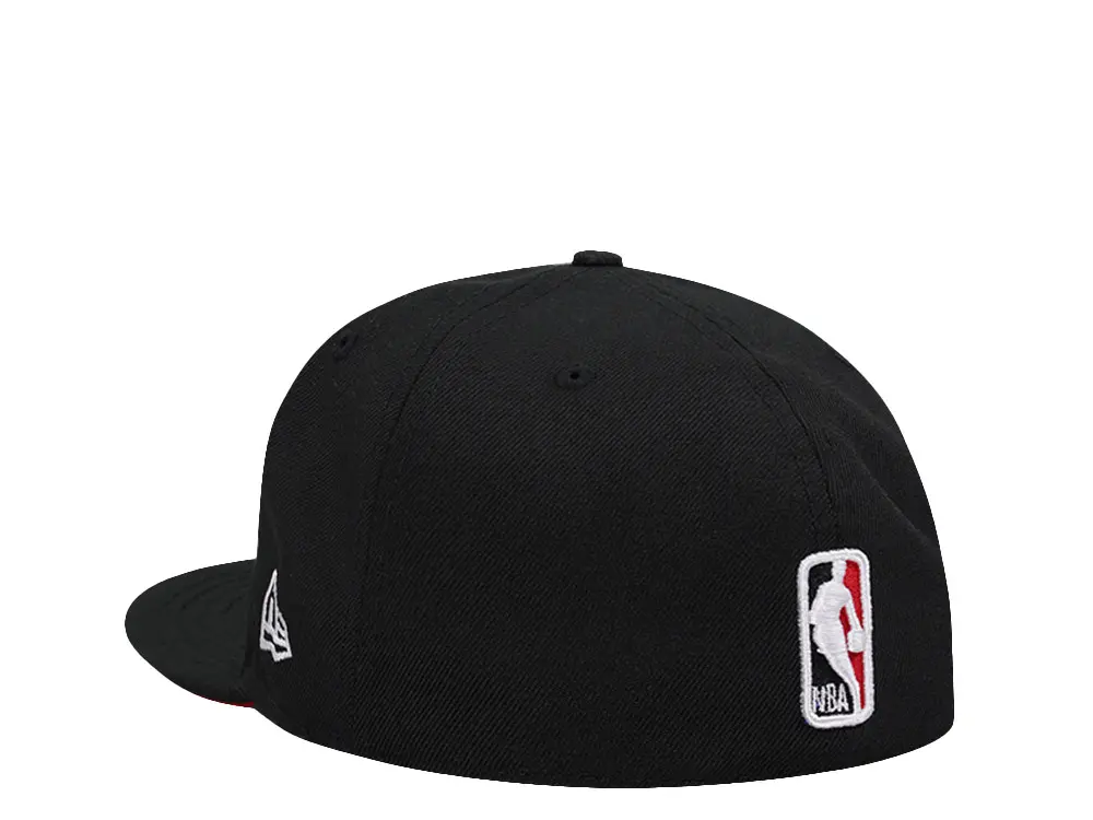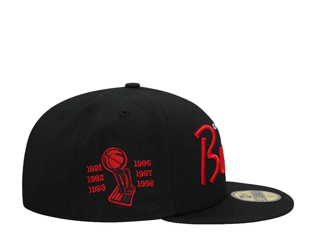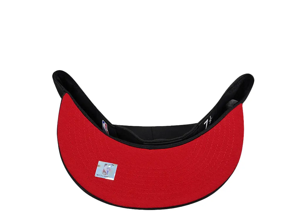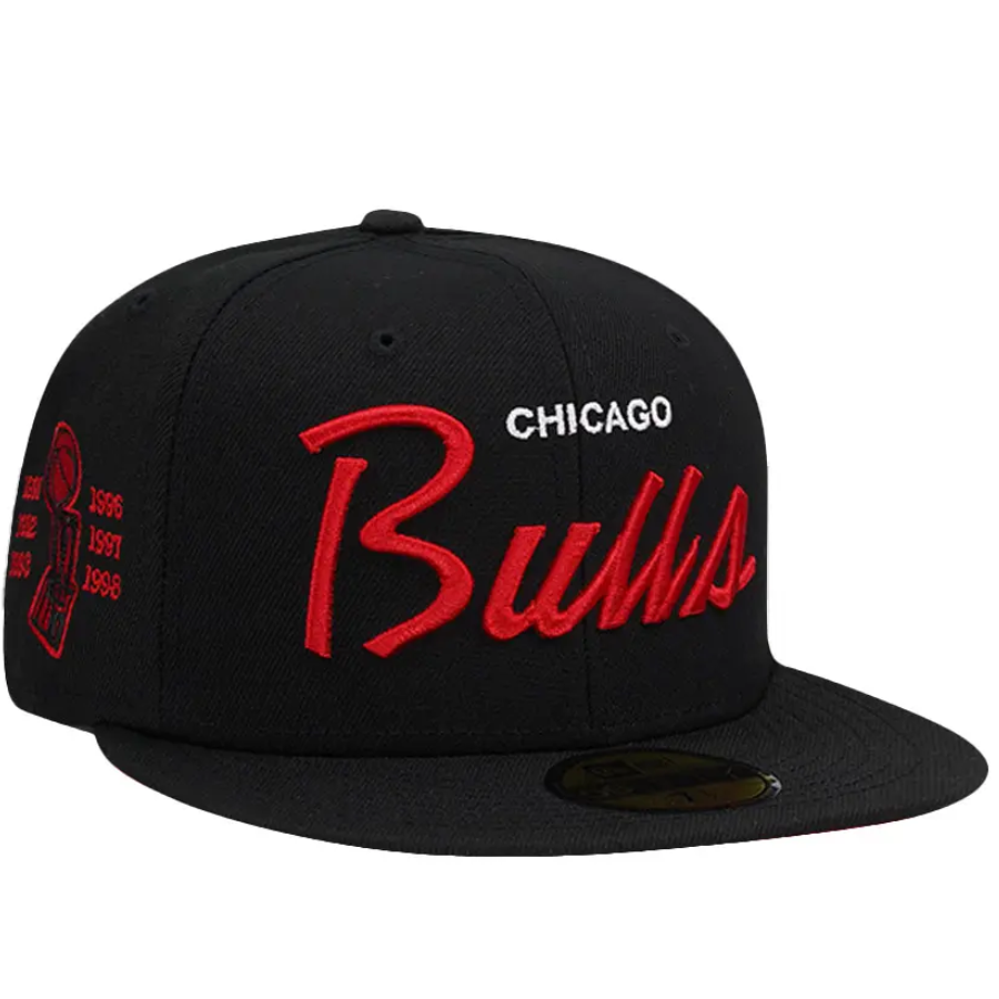 This Chicago Bulls fitted hat was released by Topperz Store. The fitted has a black six panel structured high crown and embroidered eyelets with a black fabric squatchee button. The fitted cap also has a black flat bill with a red bottom undervisor and black sweatband. The front panel features the Chicago Bulls script logo and a champions side patch on the right panel. The left panel of the fitted displays the New Era logo and the official NBA logo embroidery on the rear crown.
