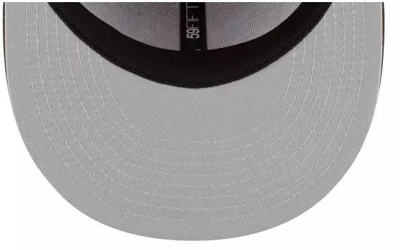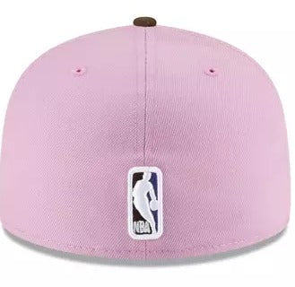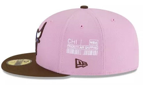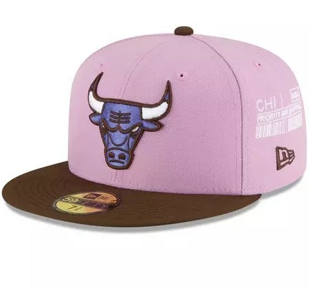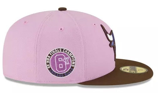This New Era Chicago Bulls 59FIFTY fitted hat was released by Hibbett. The fitted cap has a lavender six panel structured high crown and embroidered eyelets with a walnut brown fabric squatchee button . The flat bill of the fitted is also walnut brown with a grey under bill and black sweatband. The front panel includes the Chicago Bulls logo embroidered in purple and white threads outlined in brown stitching. The right panel has a 6x NBA Champions side patch. The left panel has the script "Chi NBA Priority Air Shipping" graphic.