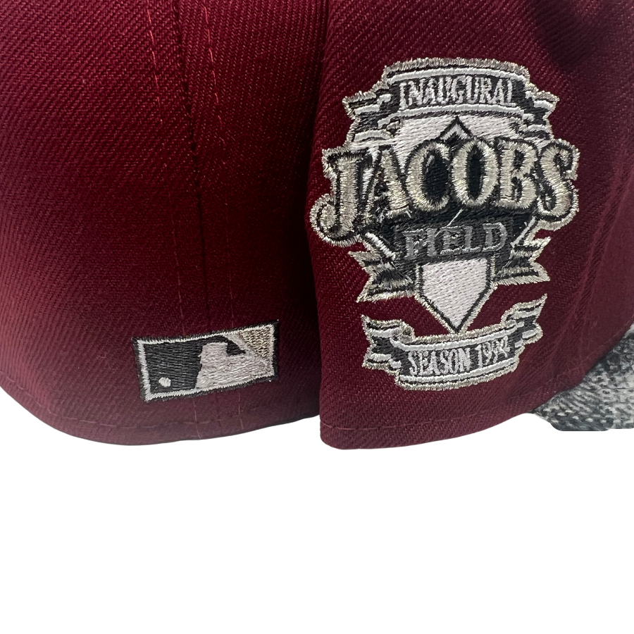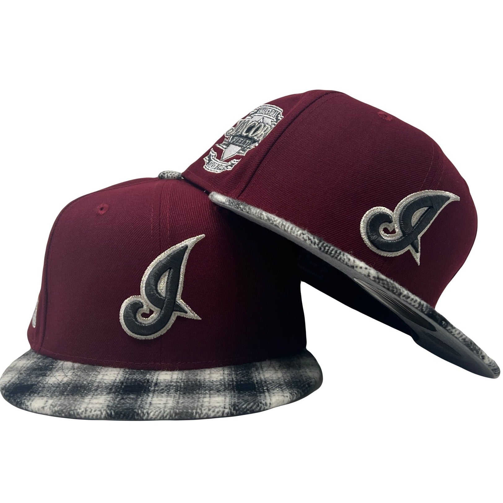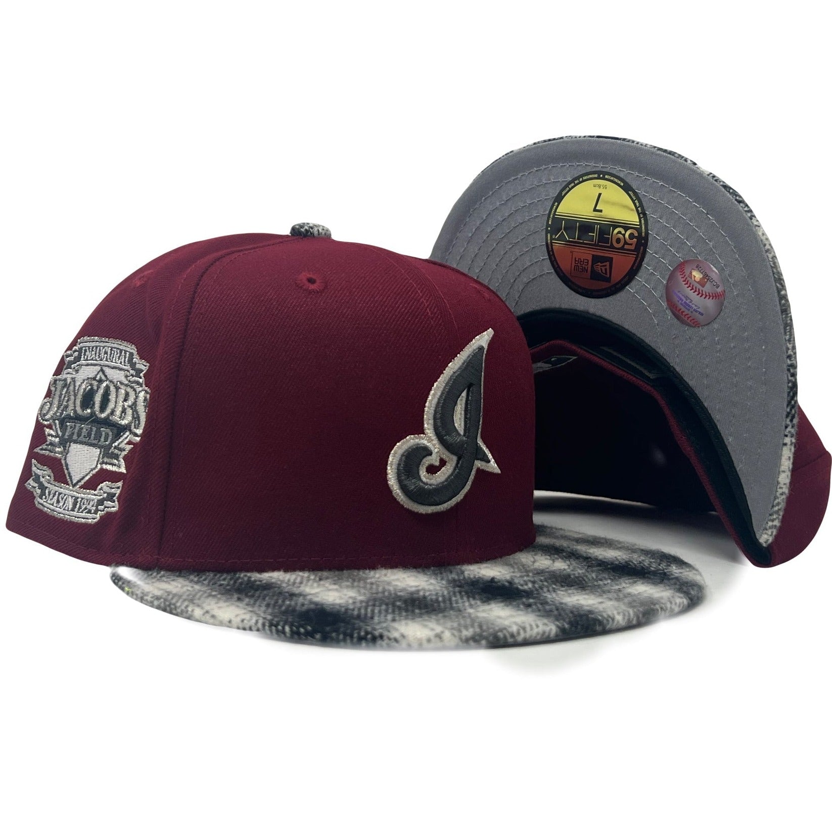 This Cleveland Indians fitted hat was released by Sports World 165. The fitted has a burgundy/maroon six panel structured high crown and embroidered eyelets with a flannel plaid fabric squatchee button. The flat bill of the cap is also flannel plaid with a grey undervisor and black sweatband. The front panel features the Cleveland Indians logo embroidery and a 1994 Inaugural Season Jacobs Field side patch embroidery on the right panel. The left panel of the fitted displays the New Era logo and the official MLB Batterman embroidery on the rear crown.