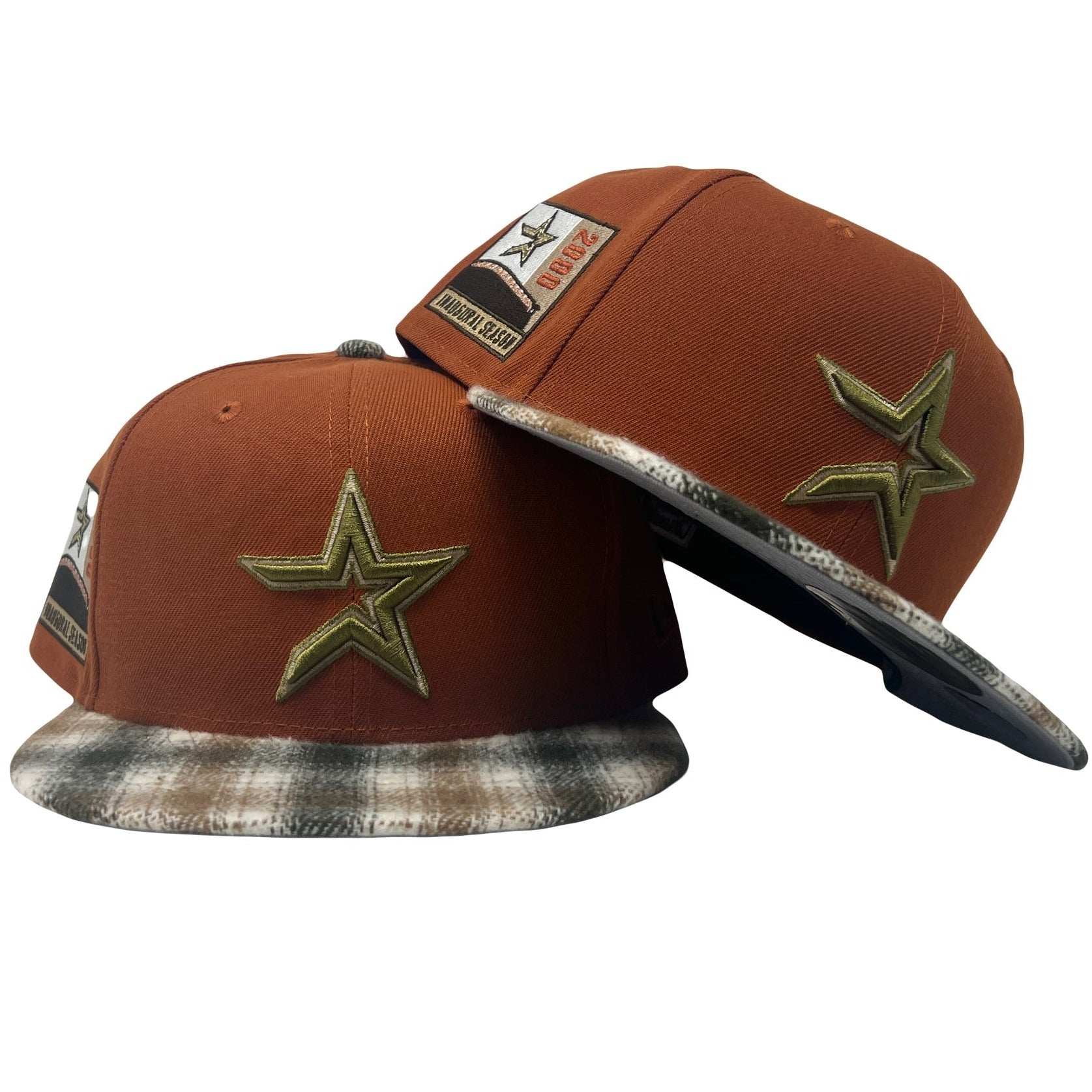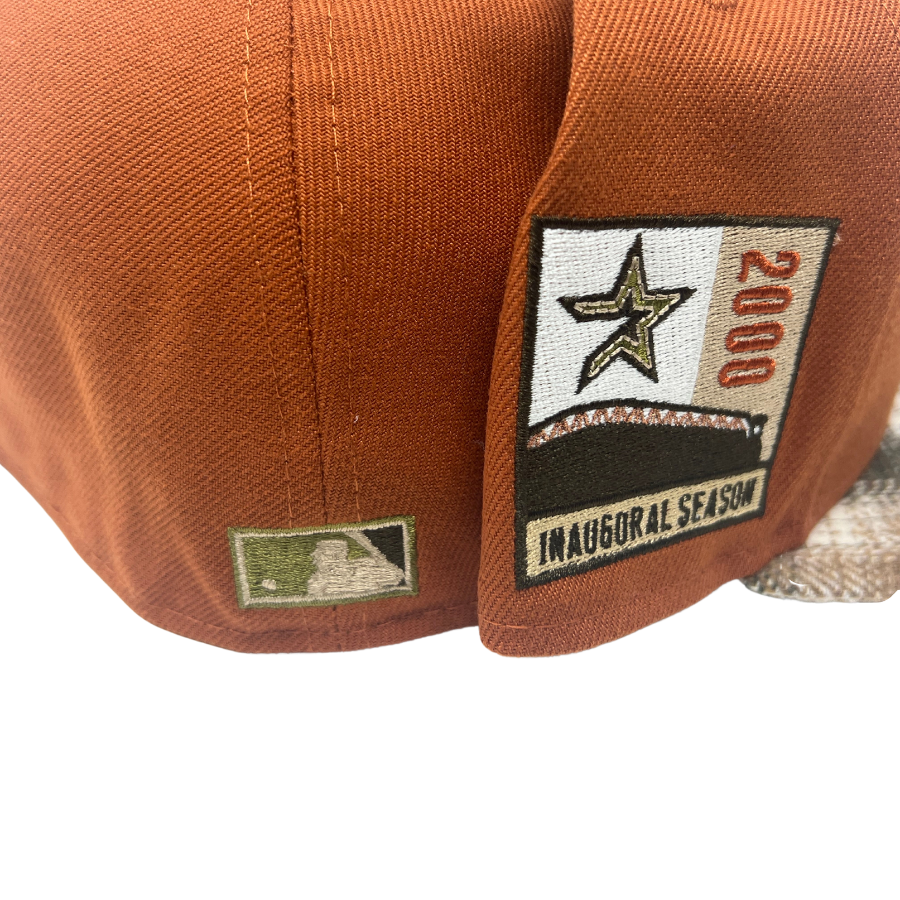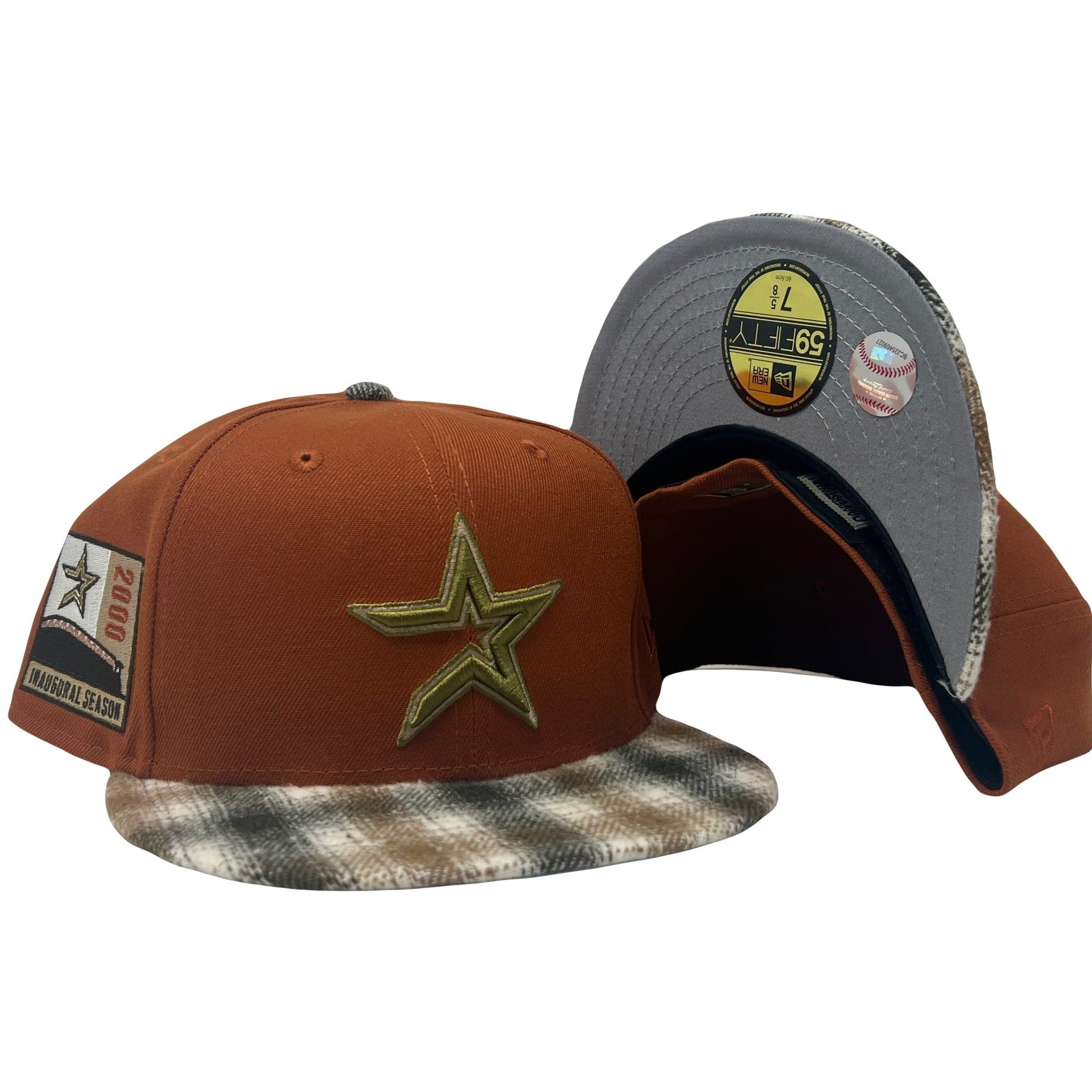 This Houston Astros fitted hat was released by Sports World 165. The fitted has a rust orange six panel structured high crown and embroidered eyelets with a flannel plaid fabric squatchee button. The flat bill of the cap is also flannel plaid with a grey undervisor and black sweatband. The front panel features the Houston Astros logo embroidery and a 2010 Inaugural Season side patch embroidery on the right panel. The left panel of the fitted displays the New Era logo and the official MLB Batterman embroidery on the rear crown.