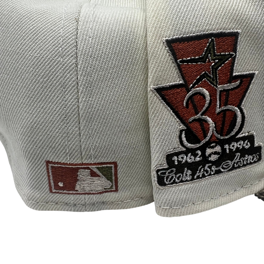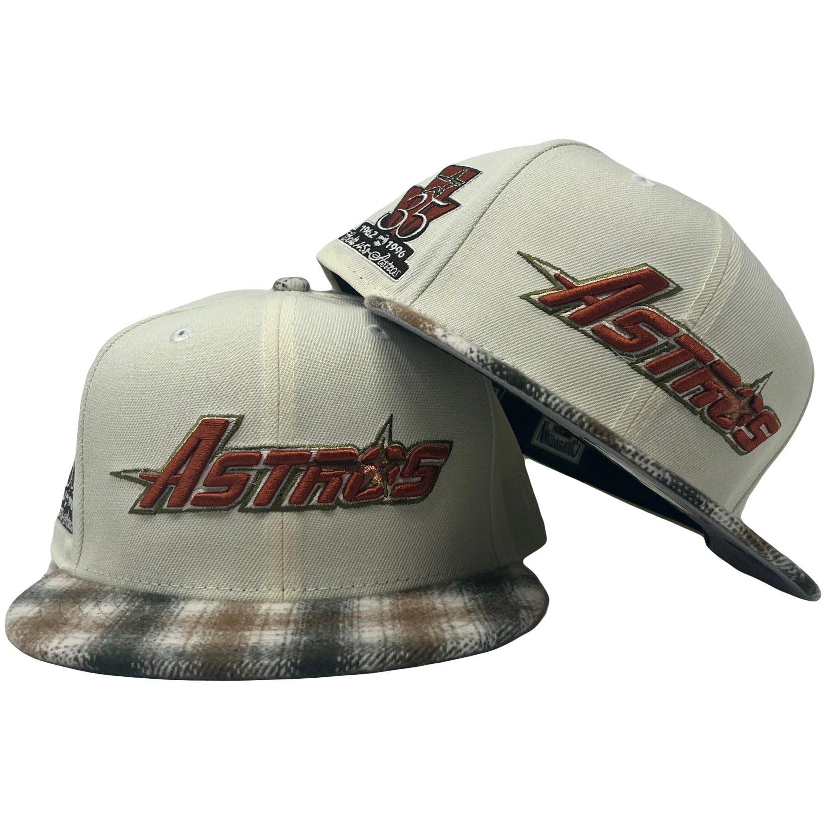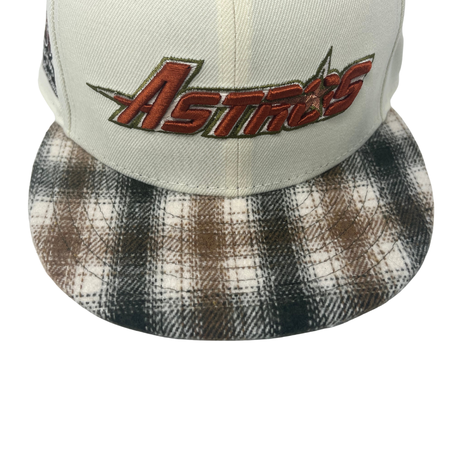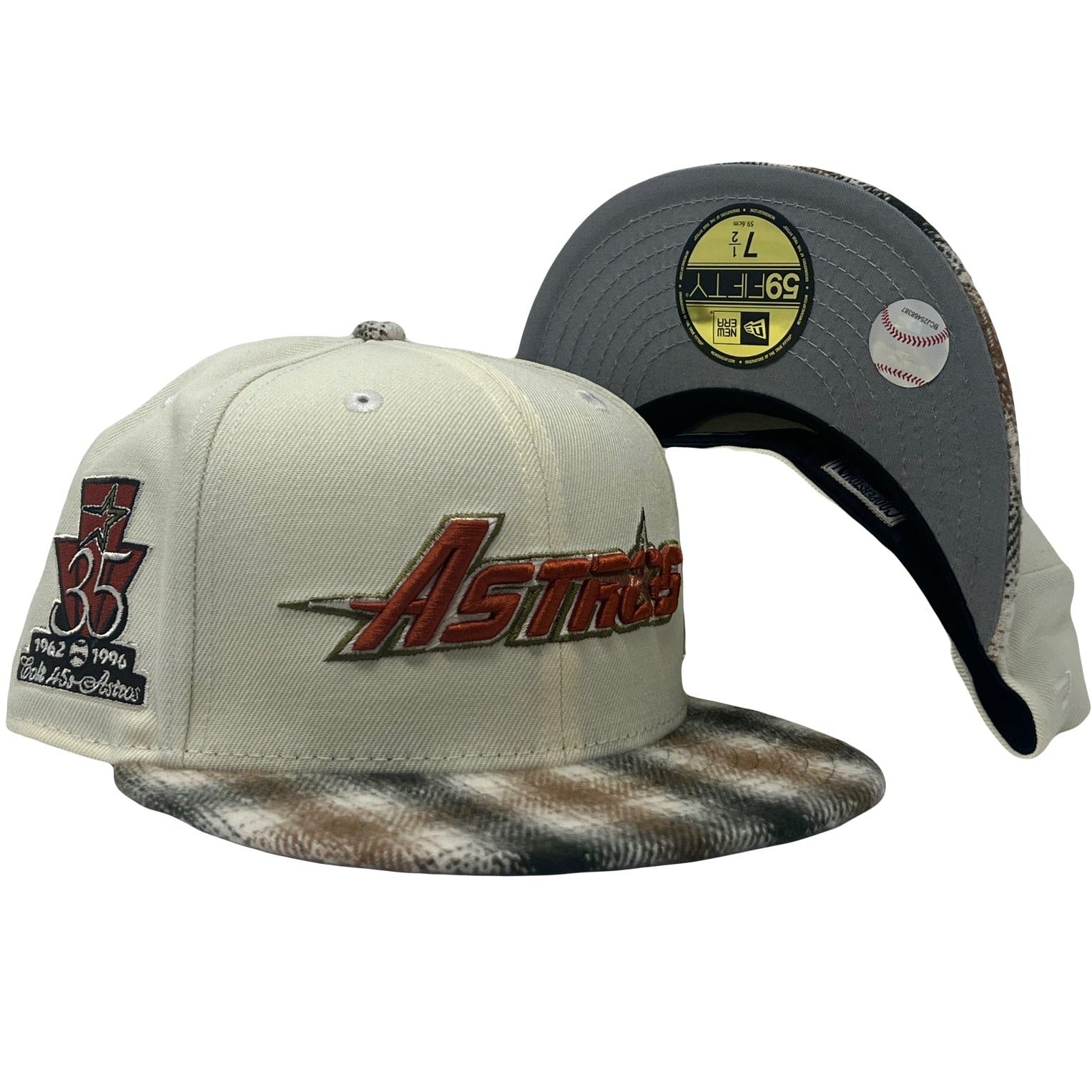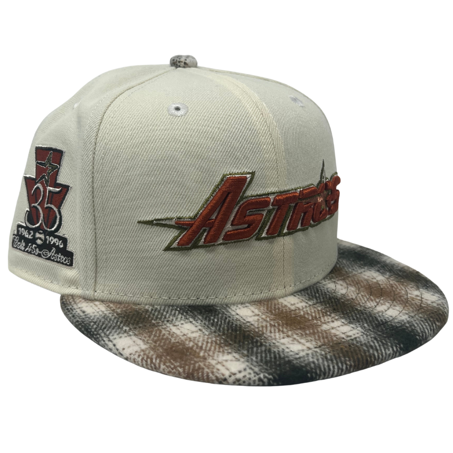 This Houston Astros fitted hat was released by Sports World 165. The fitted has a chrome six panel structured high crown and embroidered eyelets with a flannel plaid fabric squatchee button. The flat bill of the cap is also flannel plaid with a grey undervisor and black sweatband. The front panel features the Houston Astros logo embroidery and a 35th Anniversary side patch embroidery on the right panel. The left panel of the fitted displays the New Era logo and the official MLB Batterman embroidery on the rear crown.