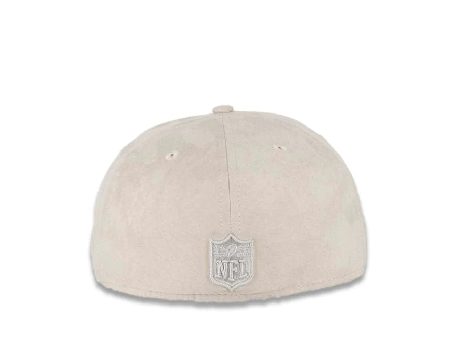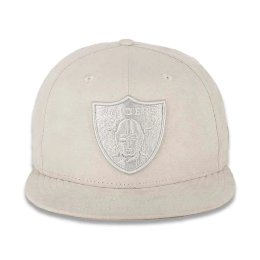 This Las Vegas Raiders fitted hat was released by Capland. The fitted has a pink suede six panel structured high crown and embroidered eyelets with a pink suede fabric squatchee button. The fitted cap also has a pink suede flat brim. The front panel features a silver embroidered Las Vegas Raiders logo.