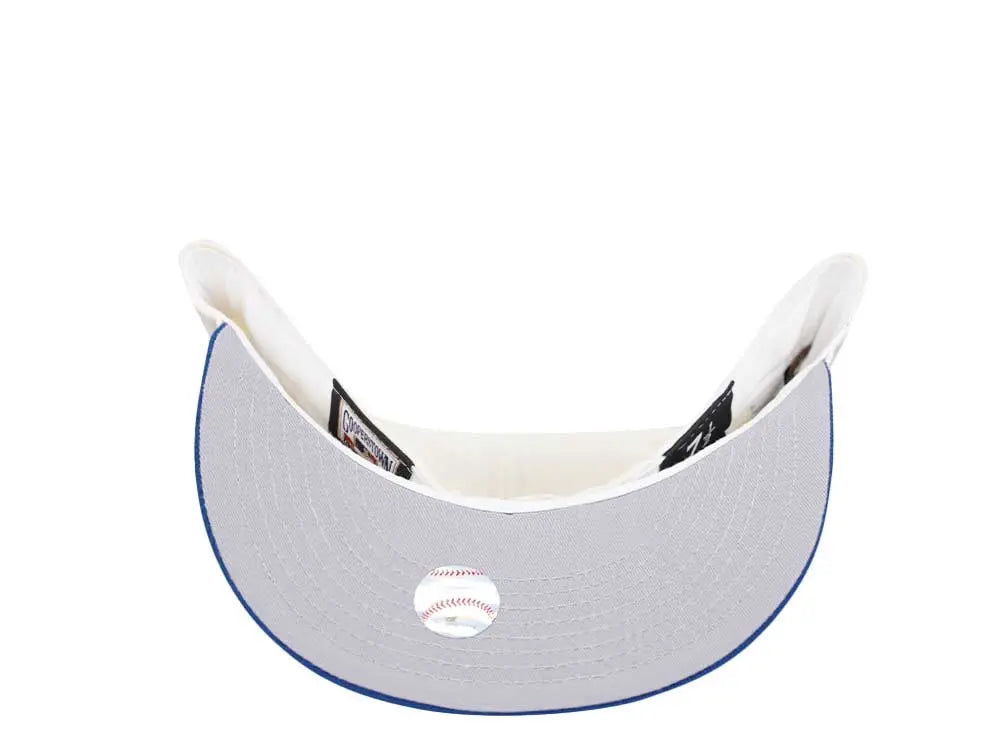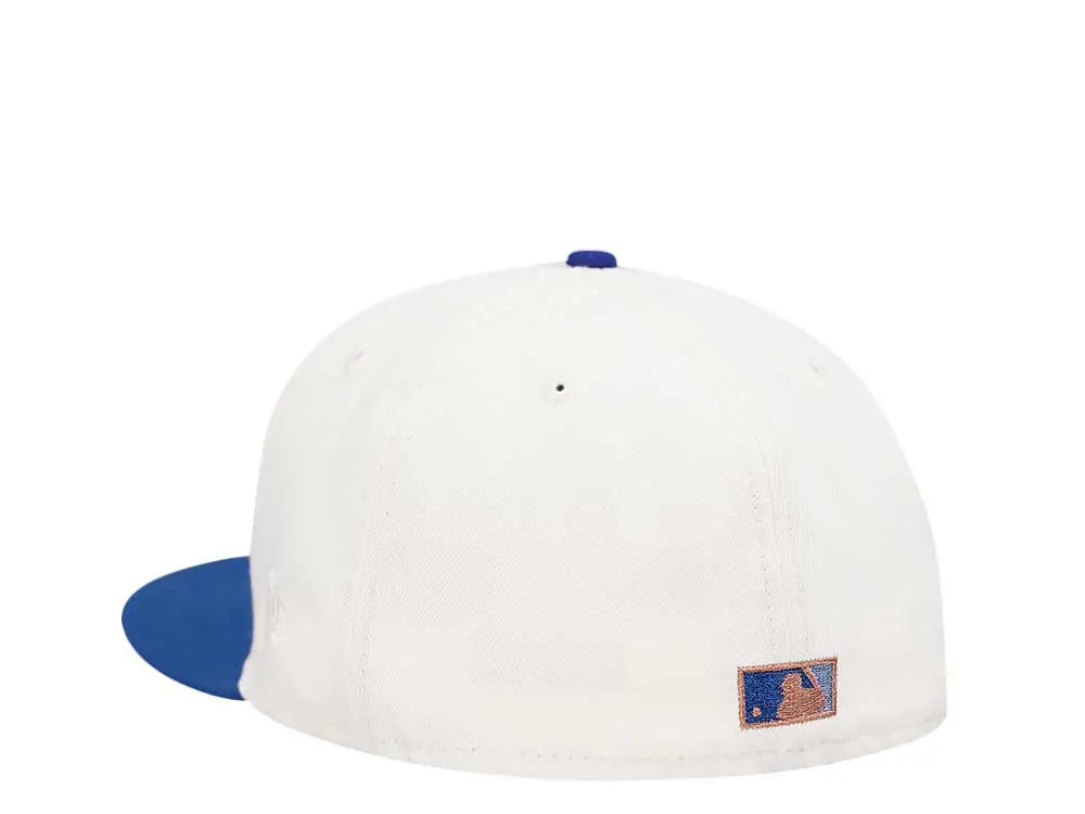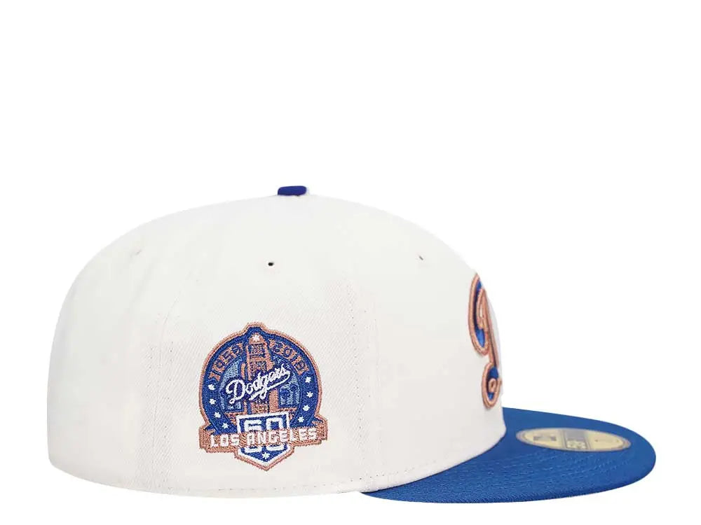 This Los Angeles Dodgers fitted hat was released by Topperz Store. The fitted has a white six panel structured high crown and embroidered eyelets with a royal blue fabric squatchee button. The fitted cap also has a royal blue flat bill with a grey undervisor and white sweatband. The front panel features the Los Angeles Dodgers "D" logo embroidered in blue and caramel threads with a 60th Anniversary side patch embroidery on the right panel. The left panel of the fitted displays the New Era logo and the official MLB Batterman logo embroidery on the rear crown.