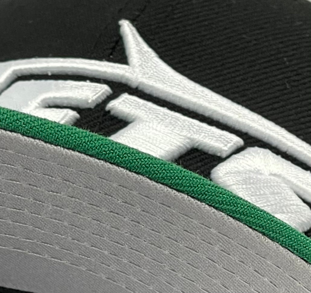 This New York Jets fitted hat was released by 4ucaps. The fitted has a black six panel structured high crown and embroidered eyelets with a black fabric squatchee button. The flat bill of the cap is green with a grey undervisor. The front panel features the New York Jets script logo embroidery and a 1990 Pro Bowl side patch on the right panel.