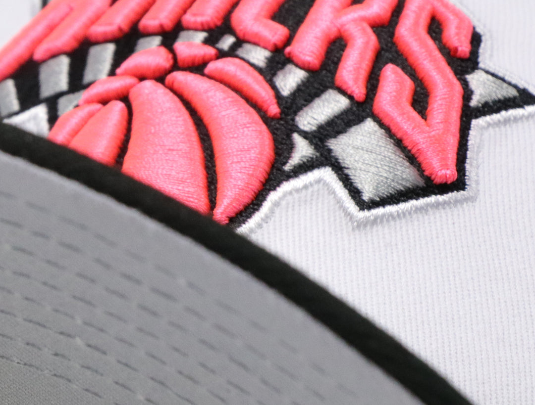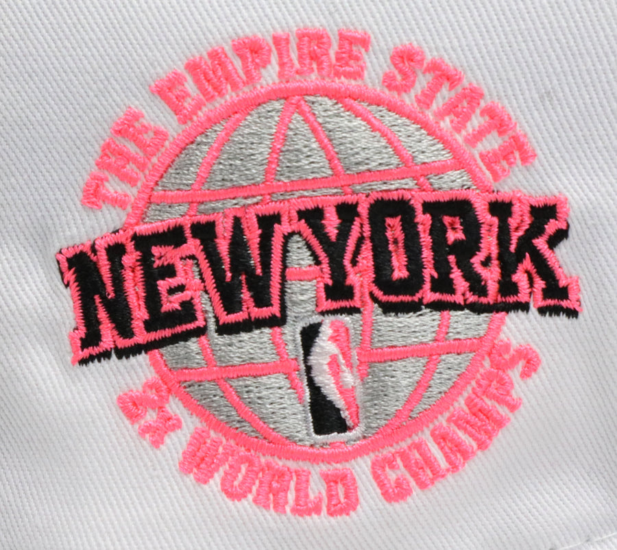 This New Era New York Knicks 59FIFTY fitted hat was released by 4ucaps. The fitted has a white six panel structured high crown and embroidered eyelets with a gray fabric squatchee button, black flat bill and a gray bottom undervisor. The front panel features the New York Knicks logo embroidered in fluorescent pink, gray & black stitching. The right-wear side has a 2x NBA Champs side patch in the same colorway.