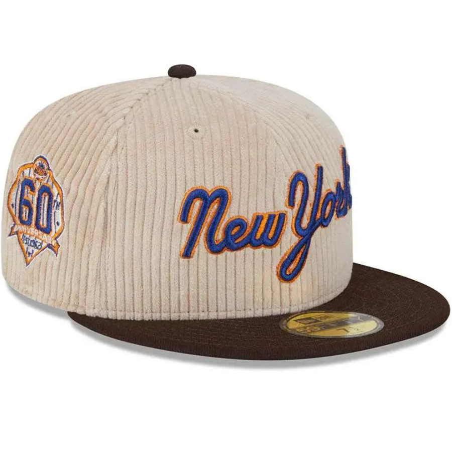 This New York Mets fitted hat was released by Topperz Store. The fitted has a tan corduroy six panel structured high crown and embroidered eyelets with a dark brown fabric squatchee button. The fitted cap also has a dark brown flat bill with a green bottom undervisor and black sweatband. The front panel features the New York Mets logo embroidery and a 60th Anniversary side patch embroidery on the right panel. The left panel of the fitted displays the New Era logo and the official MLB Batterman logo embroidery on the rear crown.