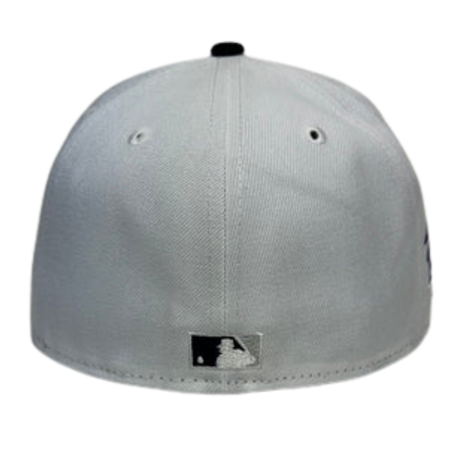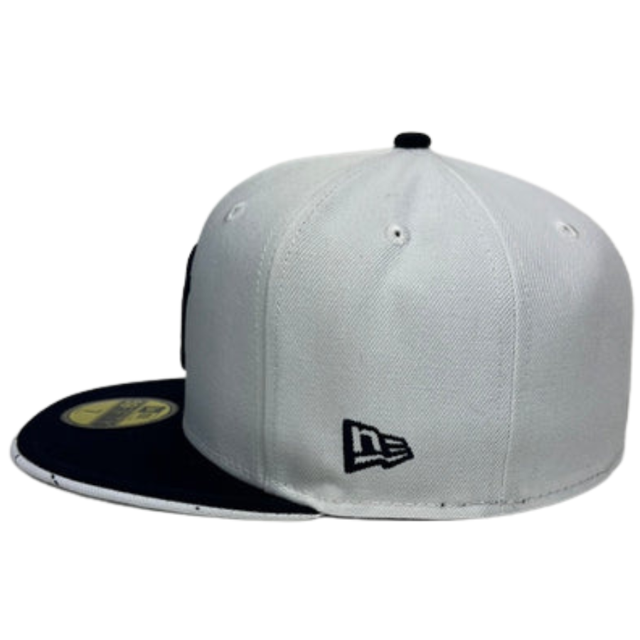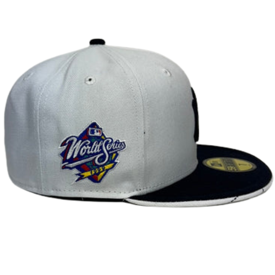This New Era New York Yankees fitted hat released by Magic Sneaker has a stone six panel structured high crown and embroidered eyelets with a navy fabric squatchee button. The fitted cap also has a navy flat bill with a white undervisor and navy pinstripe and black sweatband. The front panel features the NY Yankees logo embroidery and a 1999 World Series side patch embroidered on the right panel. The left panel of the fitted displays the New Era logo and the official MLB Batterman logo embroidery on the rear crown.
