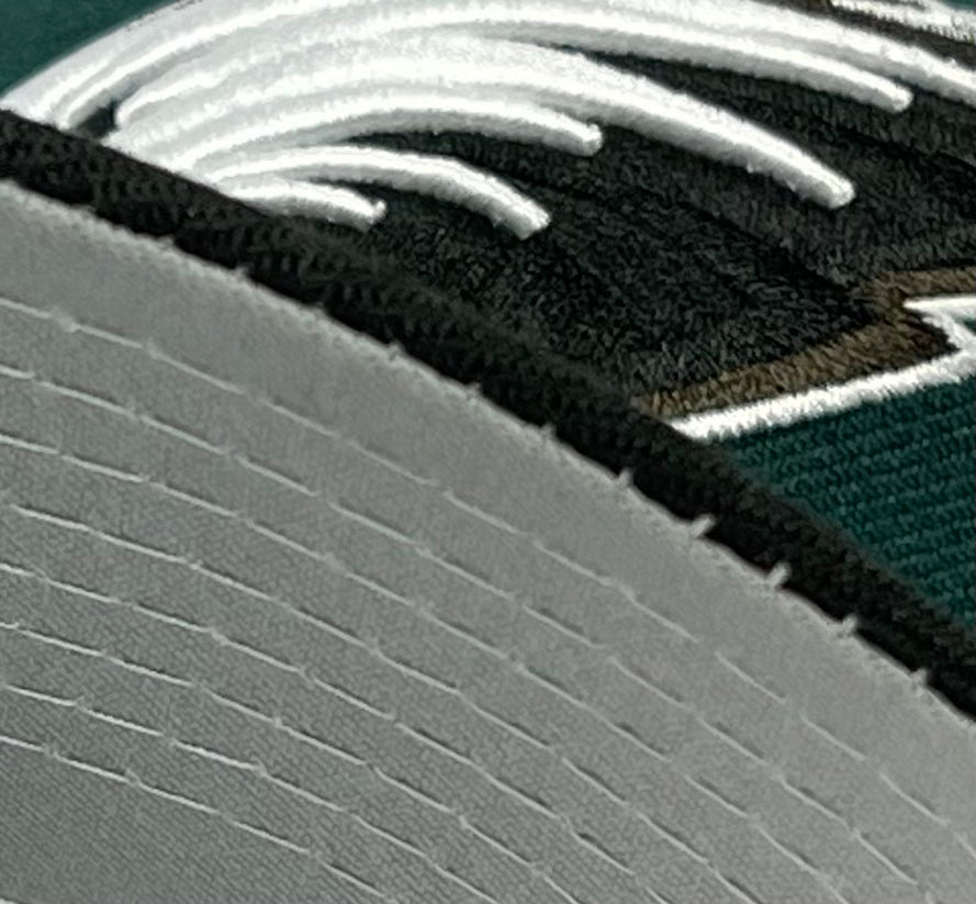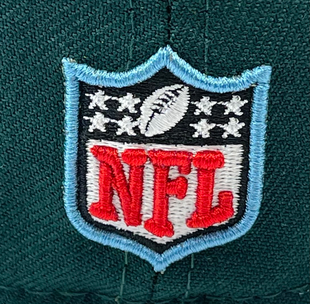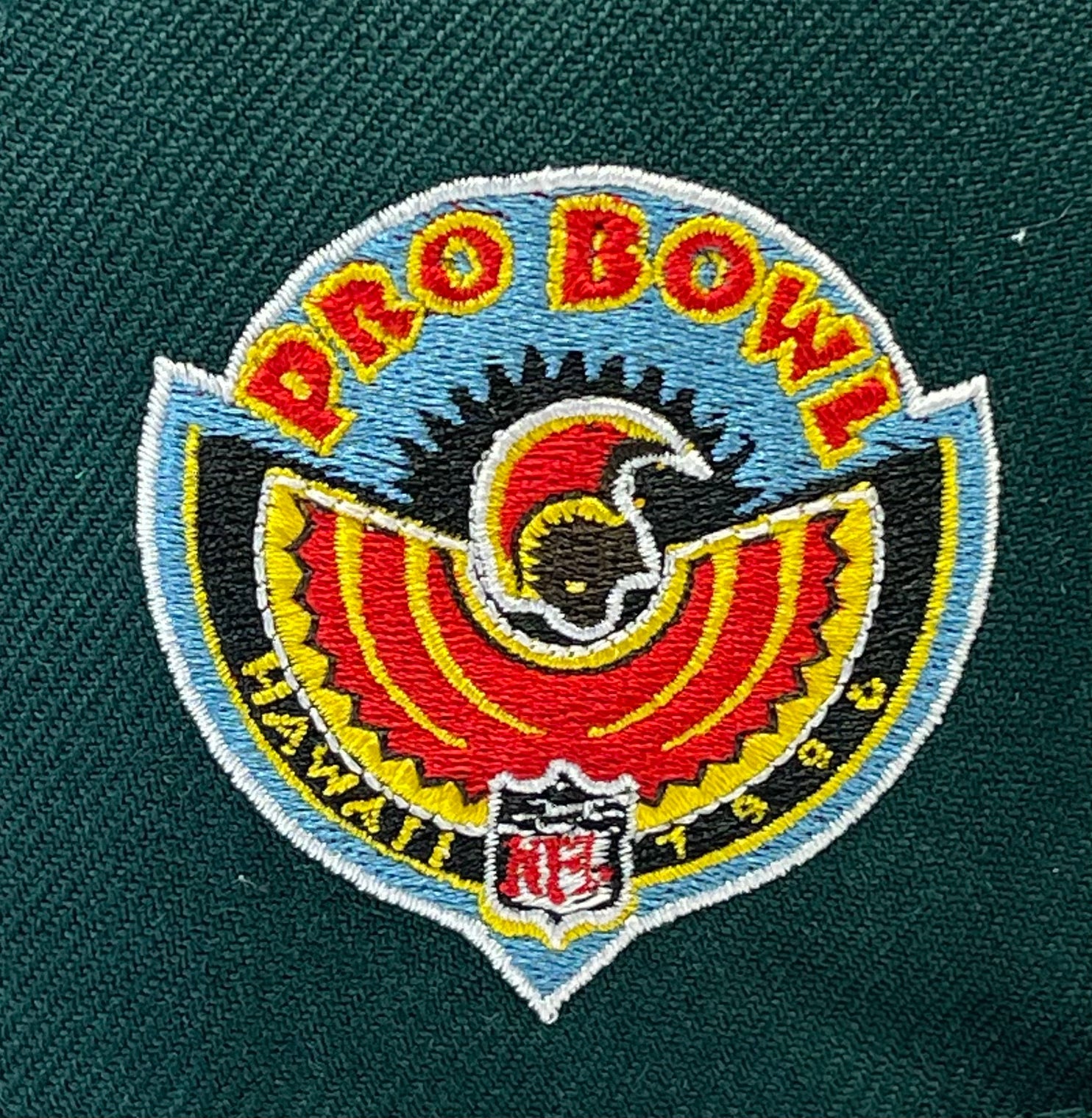 This Philadelphia Eagles fitted hat was released by 4ucaps. The fitted has a dark green six panel structured high crown and embroidered eyelets with a black fabric squatchee button. The flat bill of the cap is black with a grey undervisor. The front panel features the Philadelphia Eagles logo embroidery and a 1996 Pro Bowl side patch embroidery on the right panel.