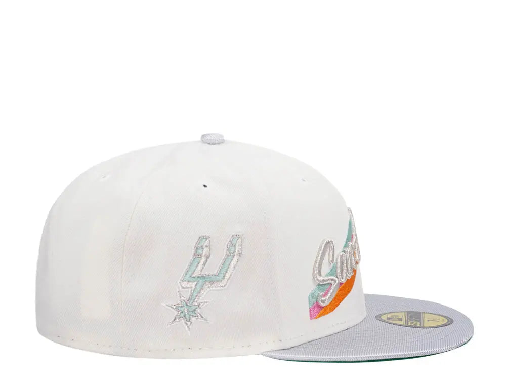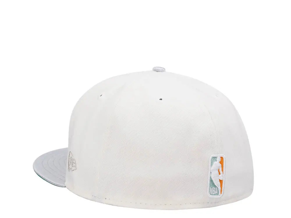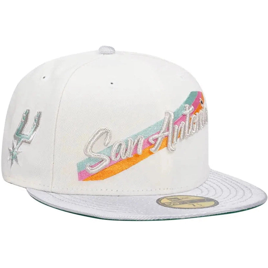 This San Antonio Spurs fitted hat was released by Topperz Store. The fitted has a white six panel structured high crown and embroidered eyelets with a chrome fabric squatchee button. The fitted cap also has a chrome flat bill with a green undervisor and black sweatband. The front panel features the San Antonio Spurs logo embroidery with a team side patch embroidery on the right panel. The left panel of the fitted displays the New Era logo and the official NBA logo embroidery on the rear crown.