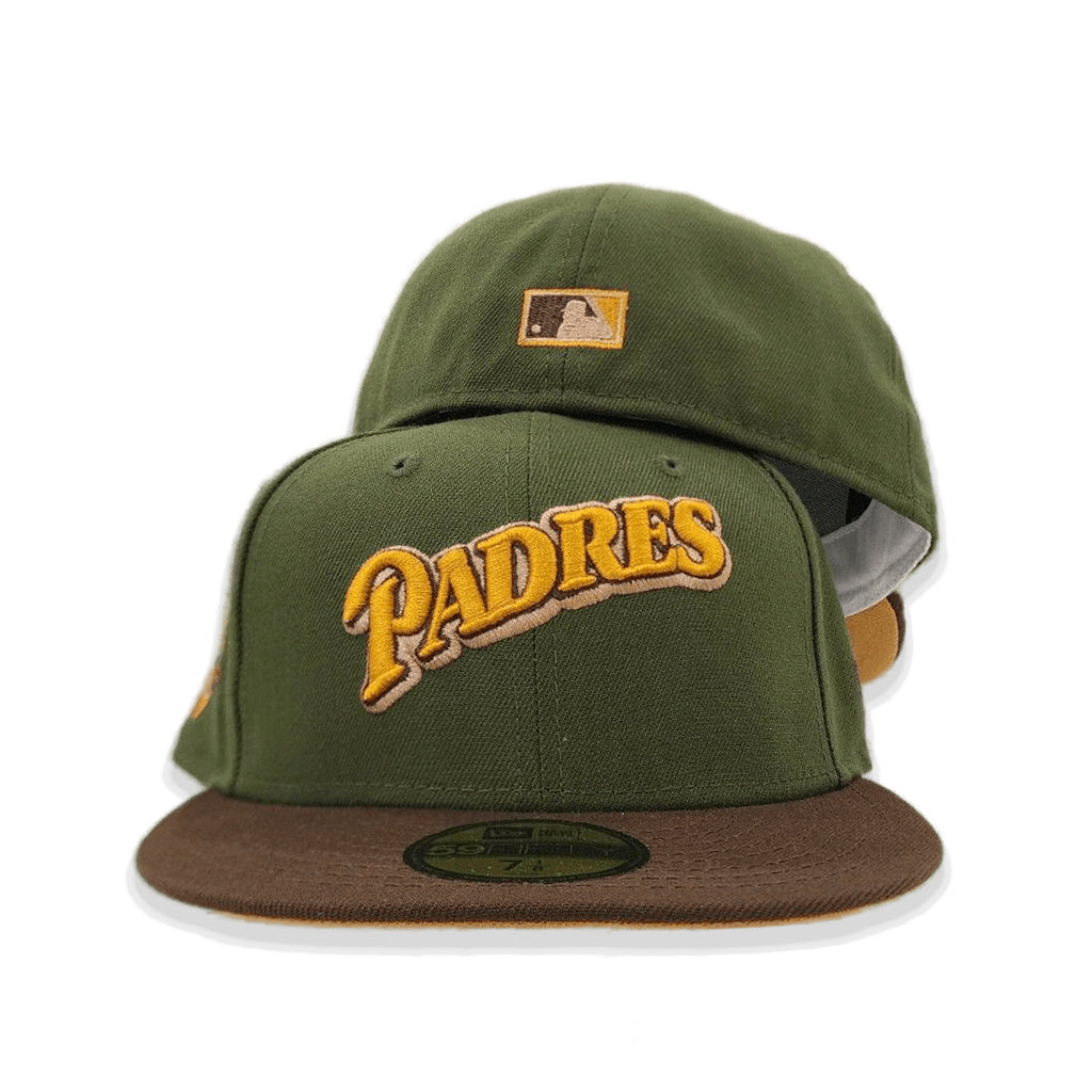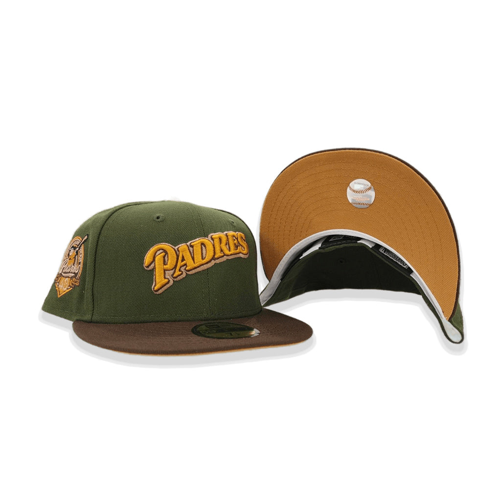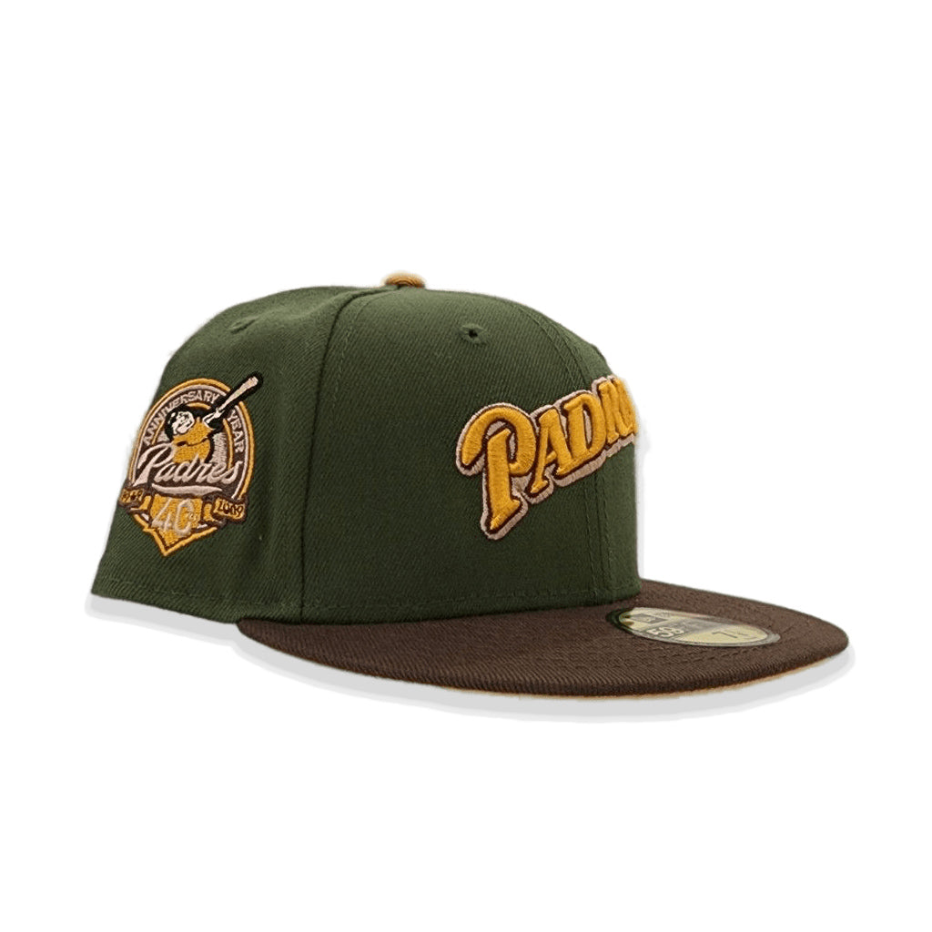This New Era Olive Green Script San Diego Padres Brown Visor Tan Bottom 40th Anniversary Side patch 59FIFTY Fitted Hat was released by Exclusive Fitted. The fitted has a olive green six panel structured high crown and embroidered eyelets with a tan fabric squatchee button. The fitted cap also has a brown flat bill with a tan undervisor. The front panel features the San Diego Padres logo embroidery and a 40th Anniversary side patch embroidery on the right panel. The left panel of the fitted displays the New Era logo and the official MLB logo embroidery on the rear crown.