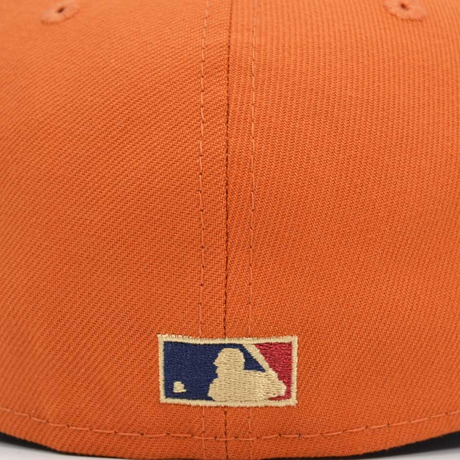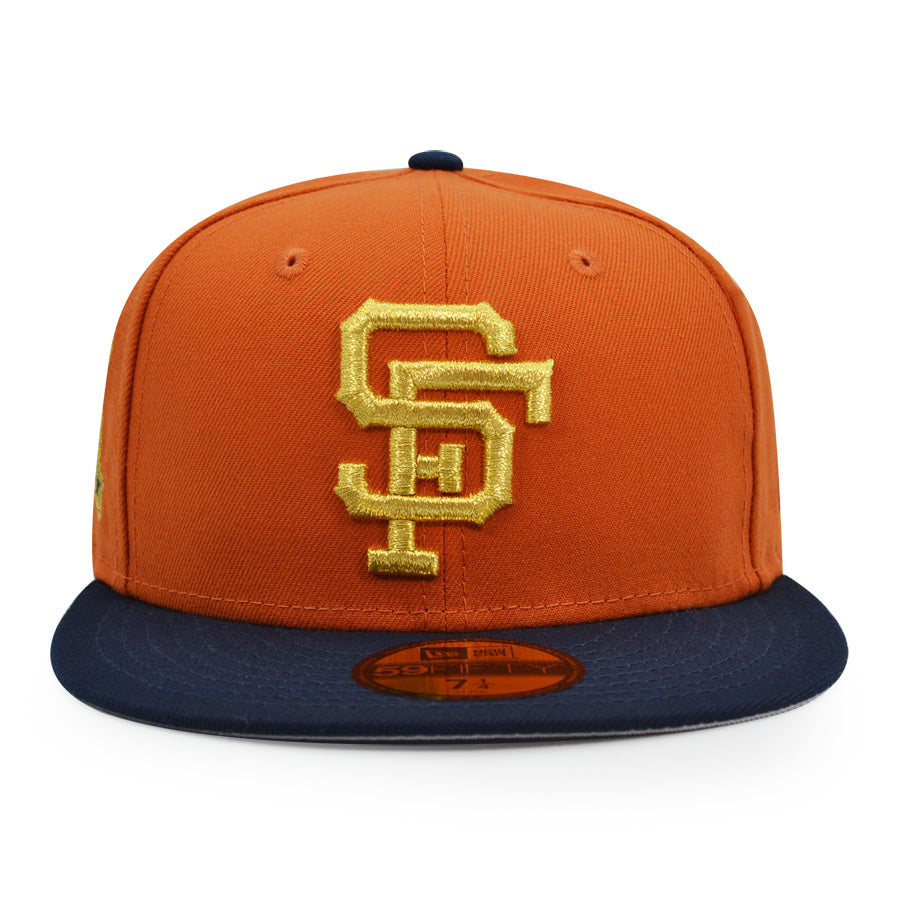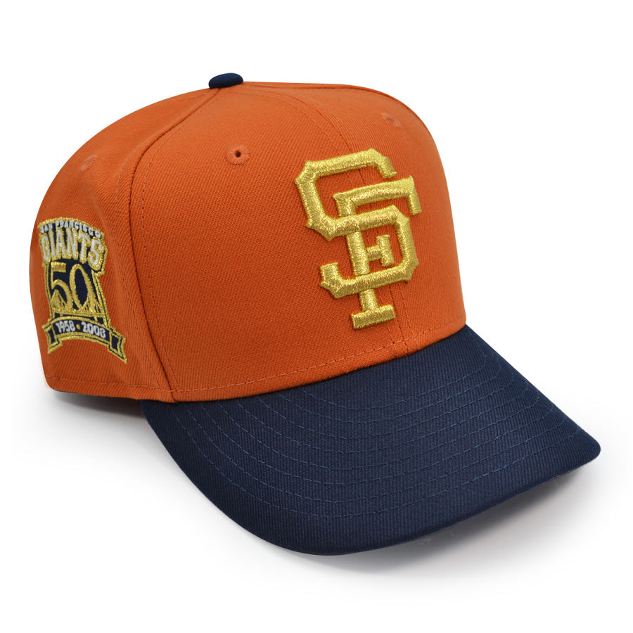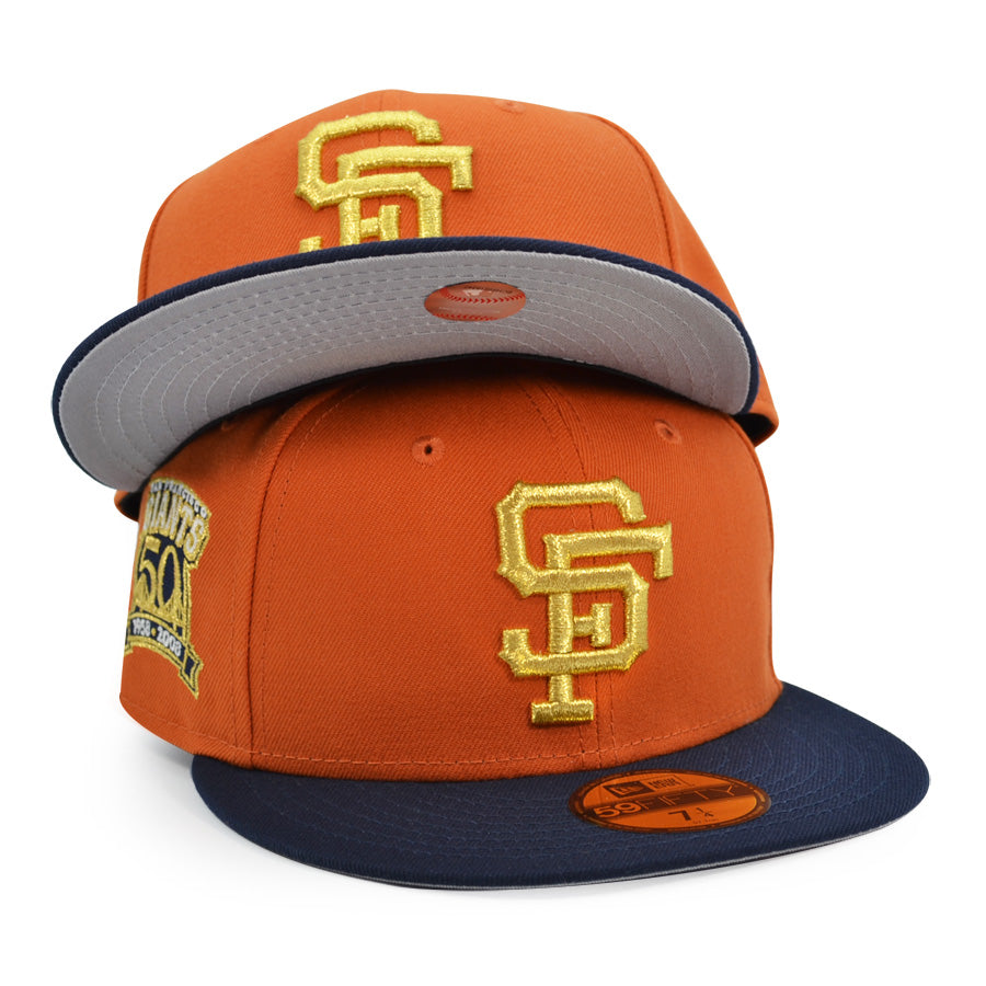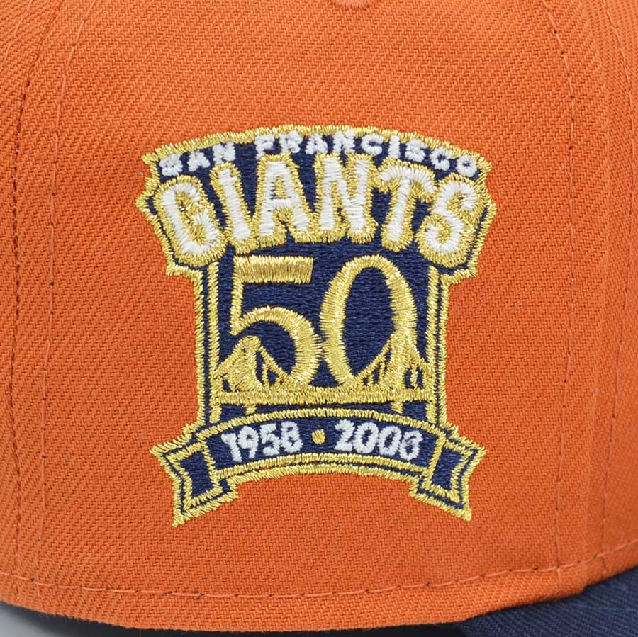 This San Francisco Giants fitted hat was released by Hat Dreams. The fitted has a flight orange six panel structured high crown and embroidered eyelets with a navy blue fabric squatchee button. The flat bill of the cap is navy blue with a gray botto undervisor. The front panel features a gold embroidered San Francisco Giants logo and a 50th Anniversary side patch on the right panel. The left panel of the fitted displays the New Era logo and the official MLB Batterman logo embroidery on the rear crown.