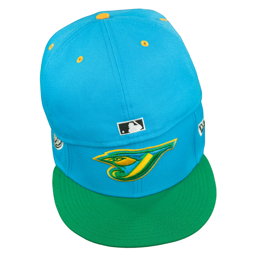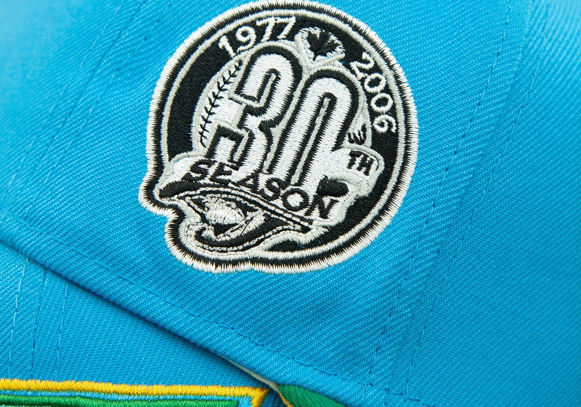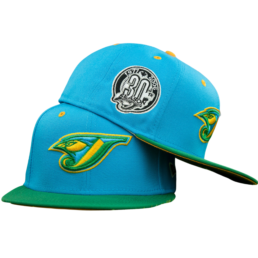 This Toronto Blue Jays fitted hat was released by Capswag. The fitted has a bright blue six panel structured high crown and yellow embroidered eyelets with a yellow fabric squatchee button. The flat bill of the cap is green with a yellow undervisor and white sweatband. The front panel features the Toronto Blue Jays logo embroidery and a 30th Season side patch on the right panel. The left panel of the fitted displays the New Era logo and the official MLB Batterman logo embroidery on the rear crown.