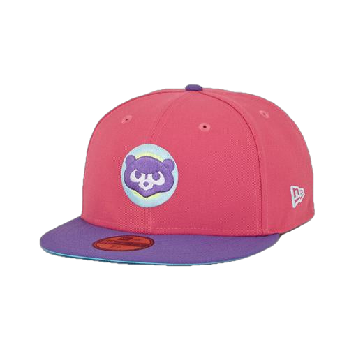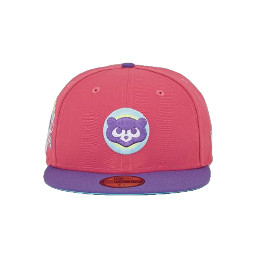 This New Era Chicago Cubs fitted hat was released by Eblens. The 59FIFTY fitted features a beetroot six panel structured high crown and embroidered eyelets with a grape purple fabric sqautchee button and flat bill. The fitted has a blue undervisor and a 1990 All-Star Game side patch embroidery.
