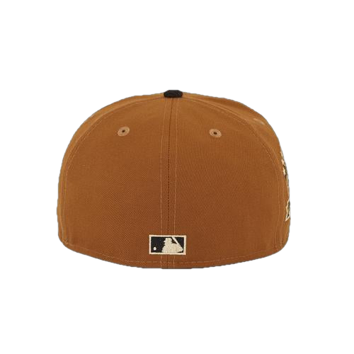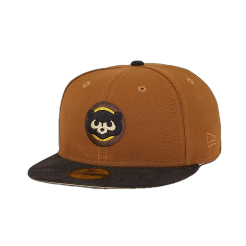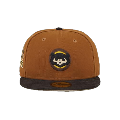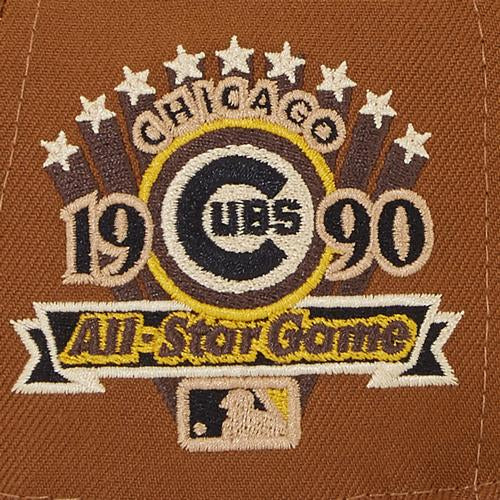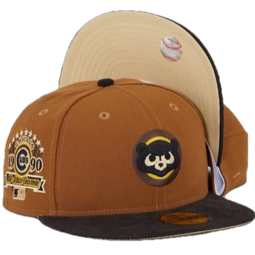 This New Era Chicago Cubs fitted hat was released by Eblens. The 59FIFTY fitted features a toasted peanut brown six panel structured high crown and embroidered eyelets with a black fabric sqautchee button and a black corduroy flat visor. The fitted has a tan undervisor and a 1990 All-Star Game side patch embroidery.