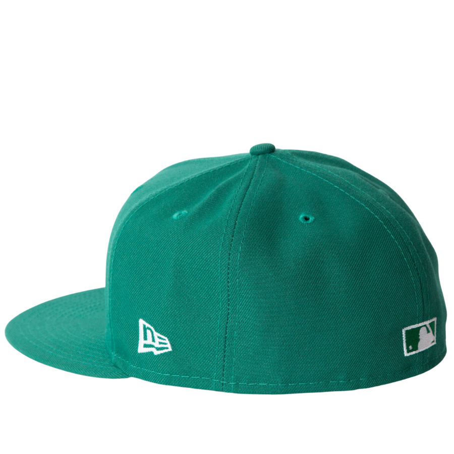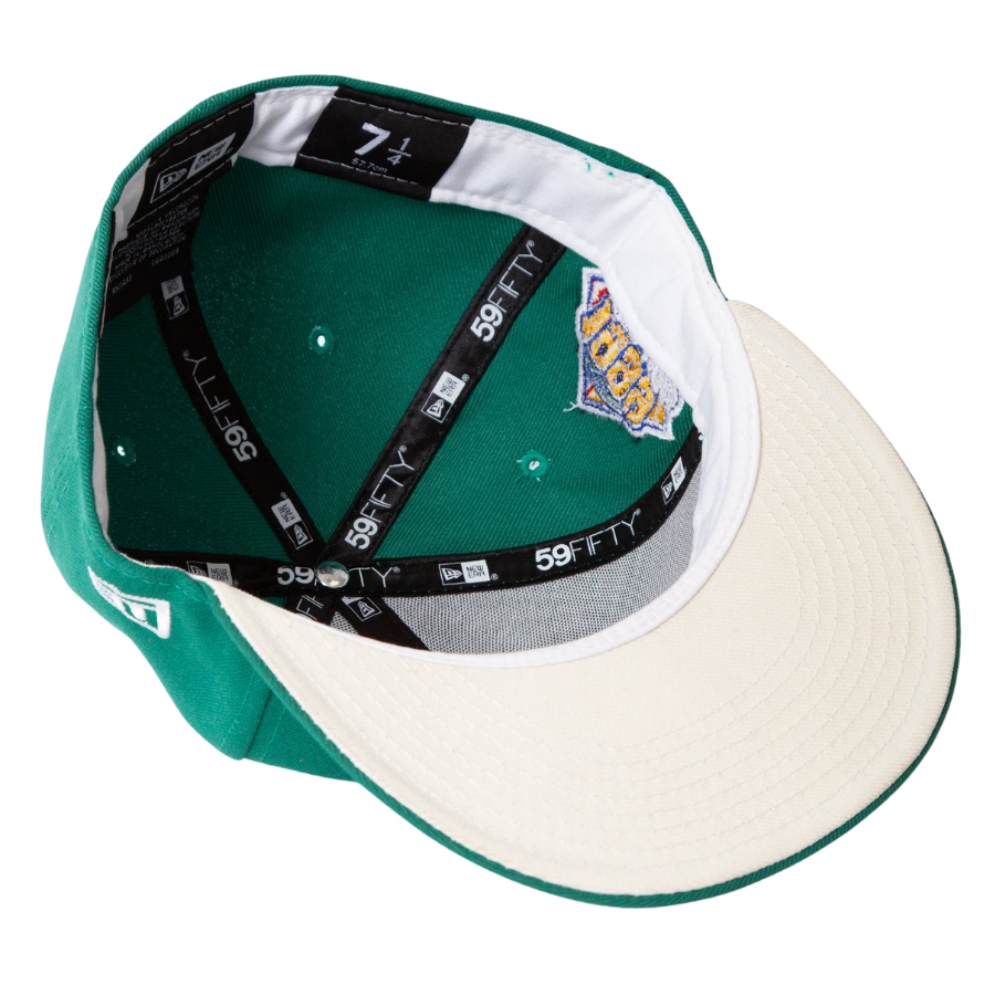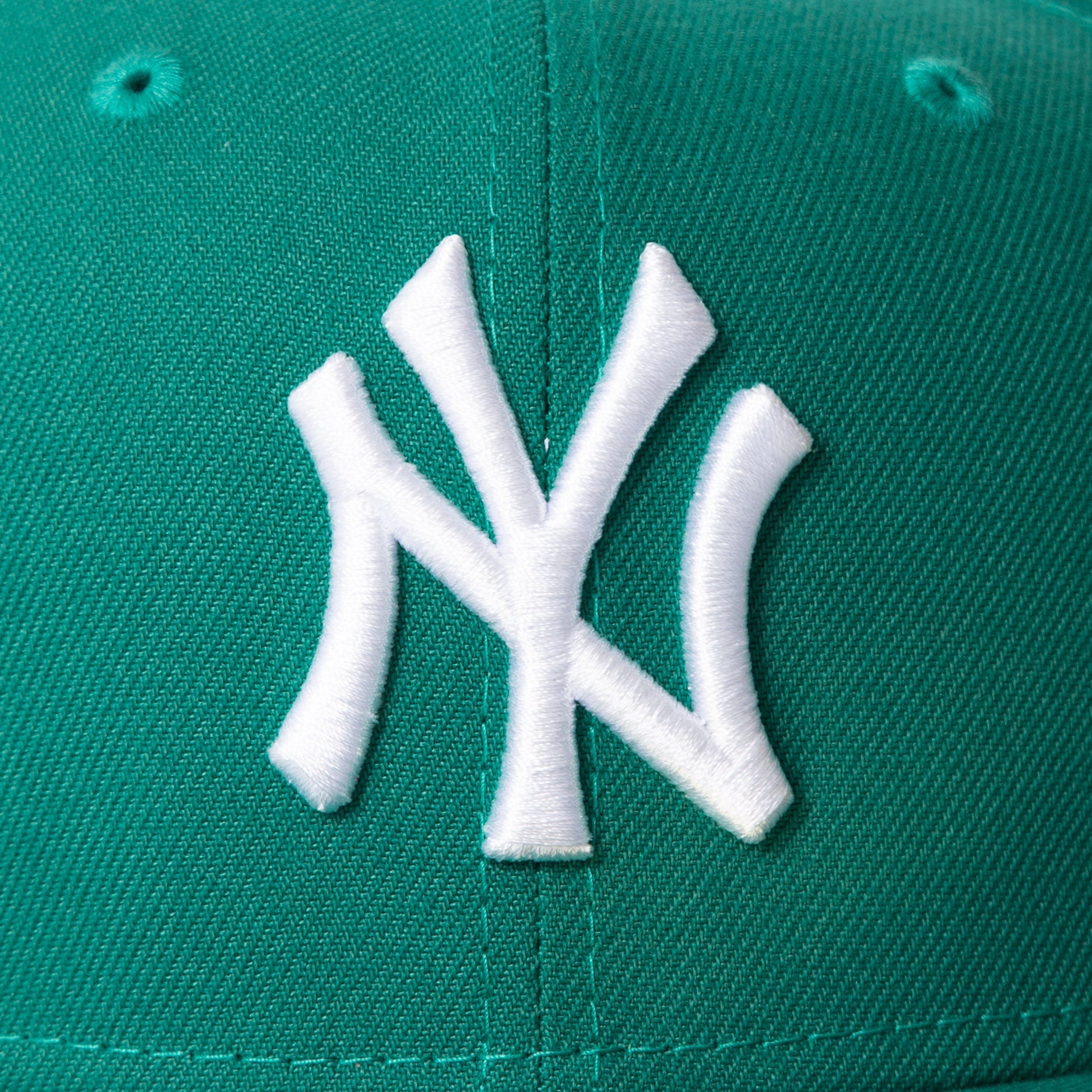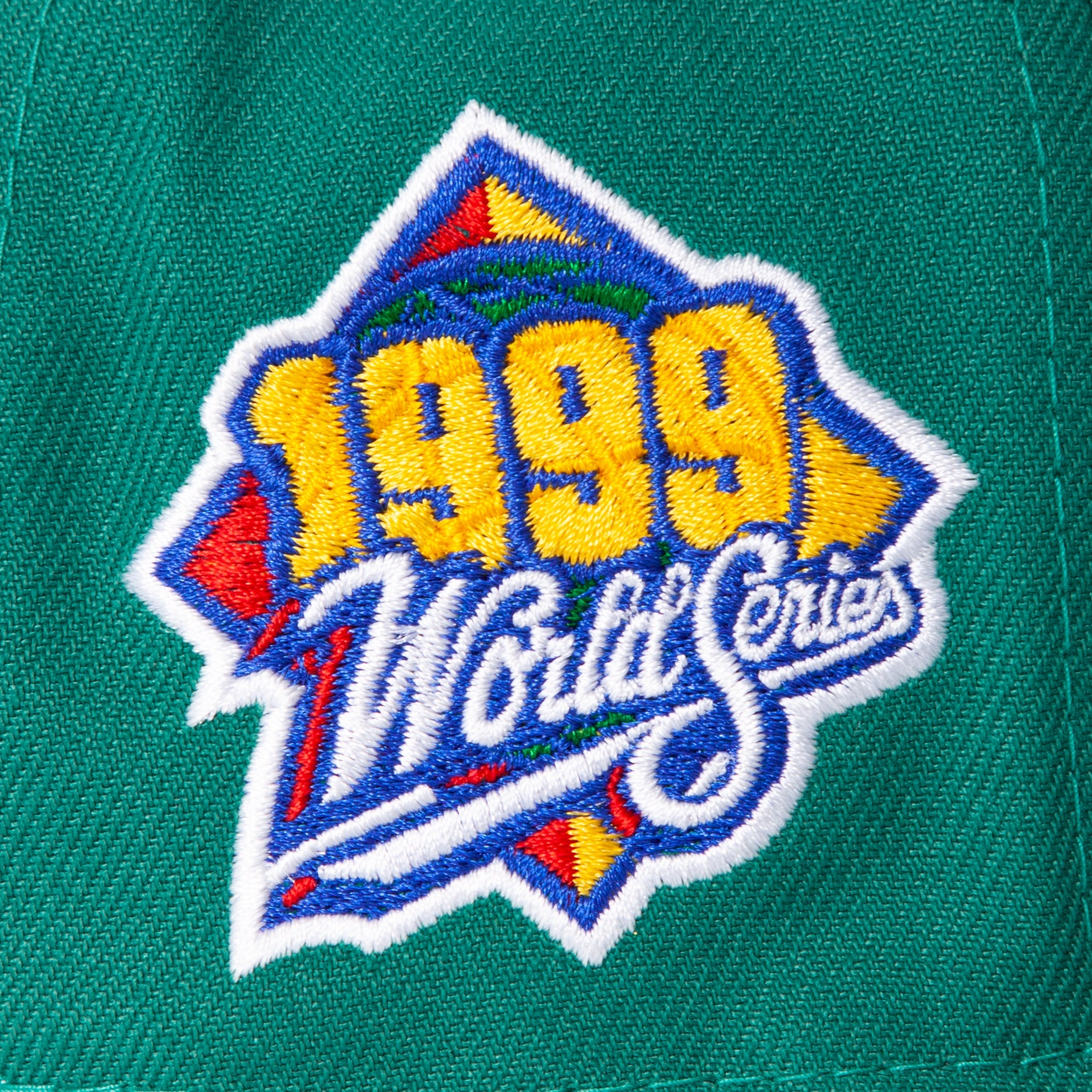 This New York Yankees fitted hat was released by Nohble. The fitted has a northwest green six panel structured high crown and embroidered eyelets, a northwest green fabric squatchee button and flat bill with a white undervisor and white sweatband. The front panel features a white stitched New York Yankees logo embroidery and a 1999 World Series side patch on the right panel. The left panel of the fitted displays the New Era "Fly Your Own Flag" logo and the official MLB Batterman embroidery on the rear crown.