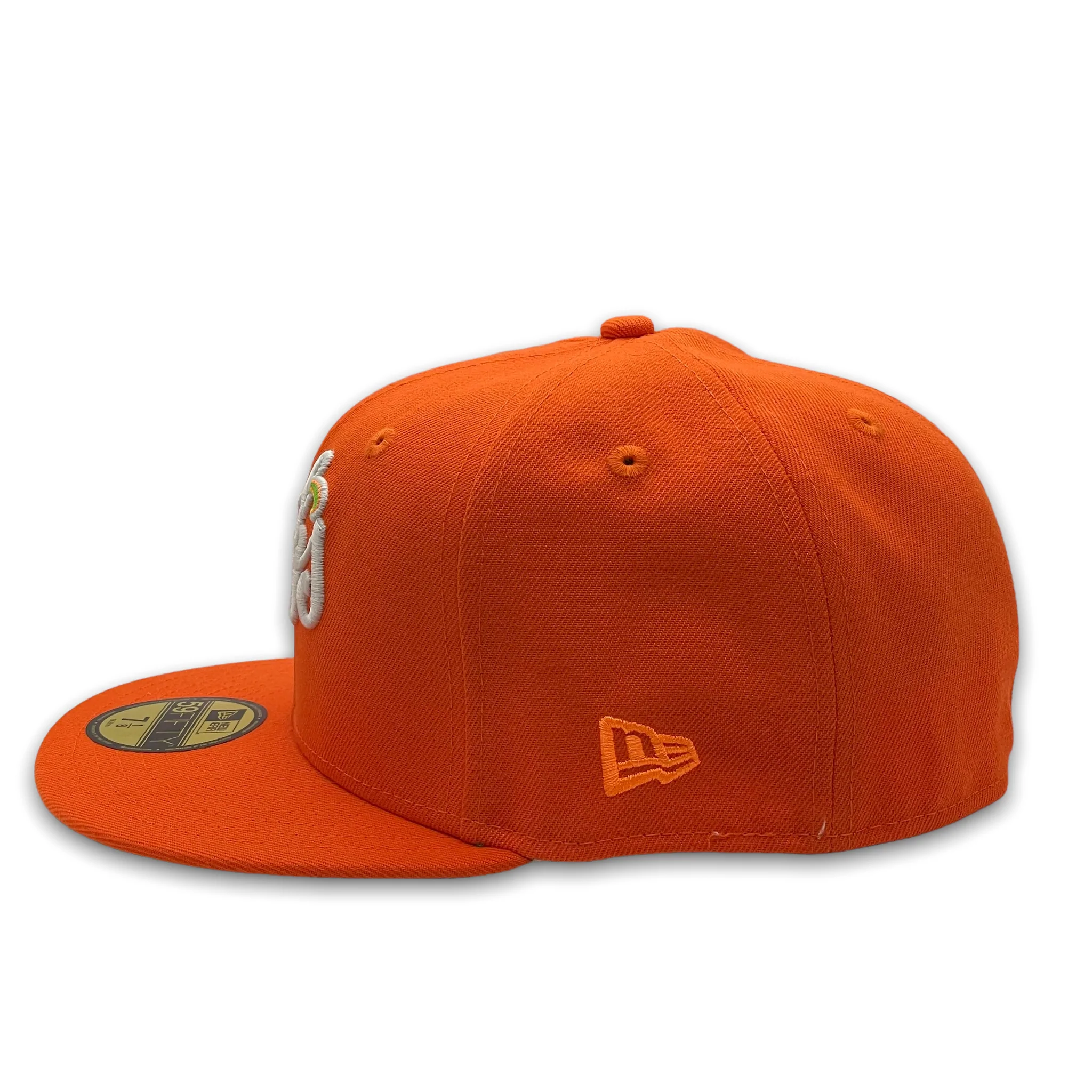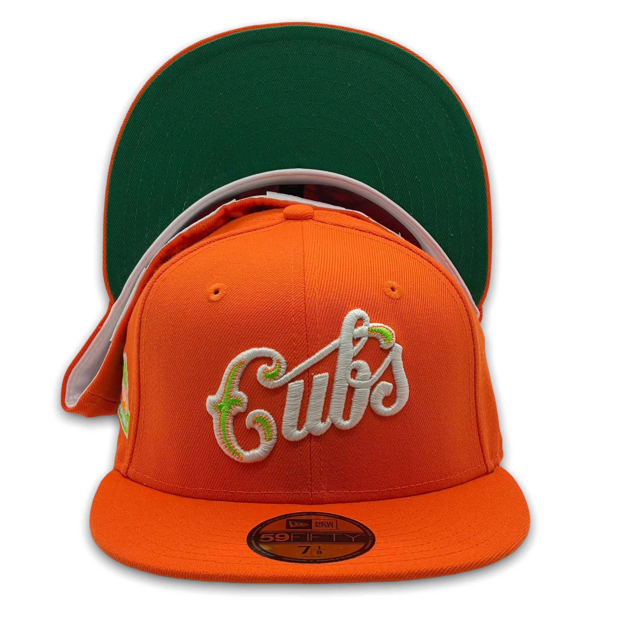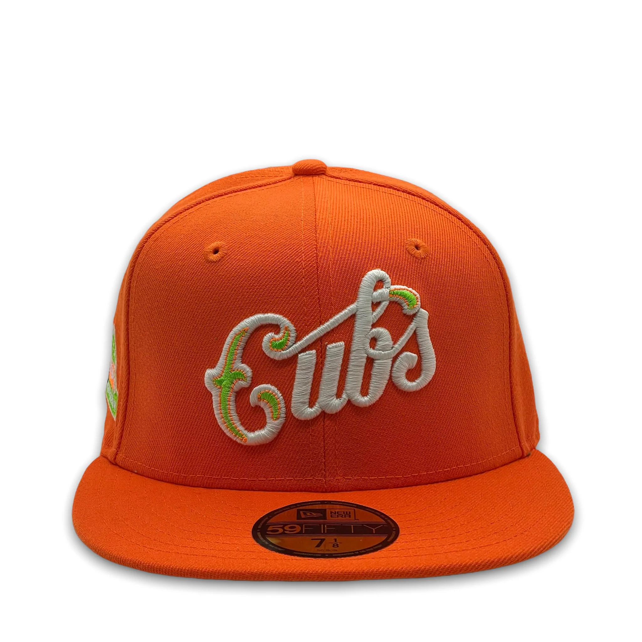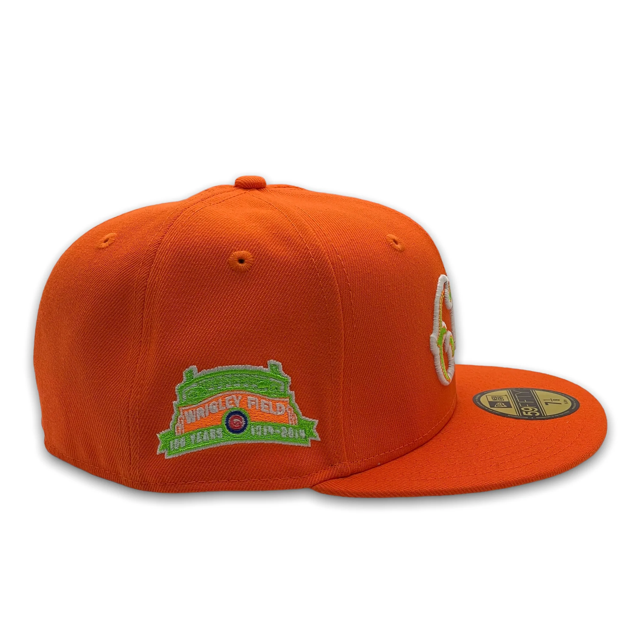 This New Era Chicago Cubs Orange 100 Years Wrigley Stadium Green UV 59FIFTY Fitted Hat has an orange six panel structured high crown, embroidered eyelets and fabric squatchee button. The fitted cap has an orange flat bill with a green undervisor with a white sweatband. The front panel features the Chicago Cubs logo embroidery and an 100 Years side patch embroidery on the right panel. The left panel of the fitted displays the New Era logo and the official MLB logo embroidery on the rear crown.