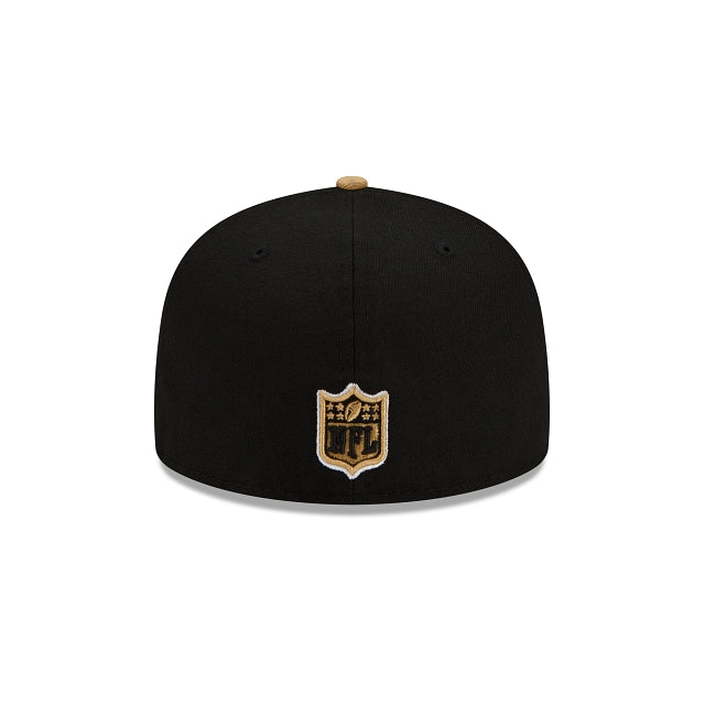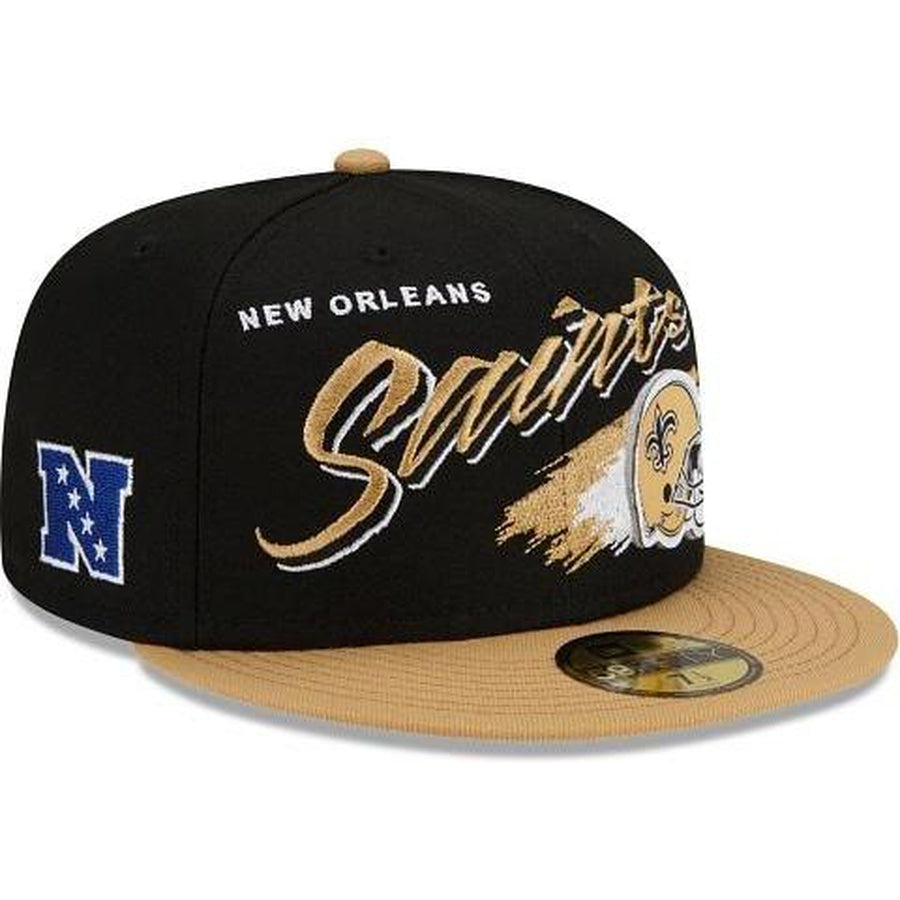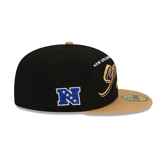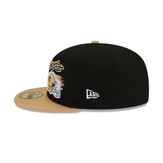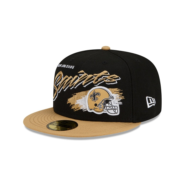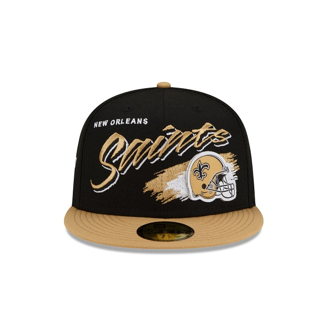 Rewind time with the New Orleans Saints Helmet 59FIFTY Fitted Cap featuring an embroidered Saints script, complimented by a raised team helmet at the front panels with a division patch at the right-wear side and the NFL Shield at the rear.