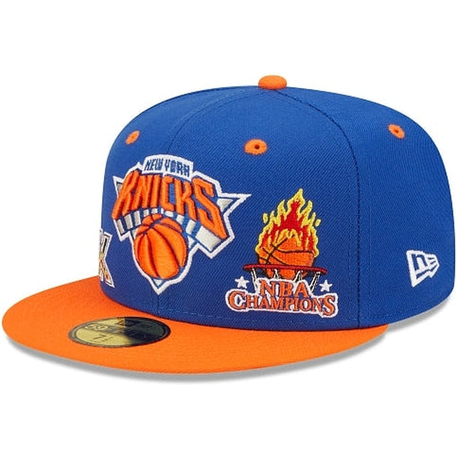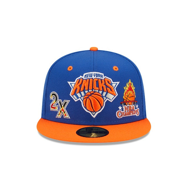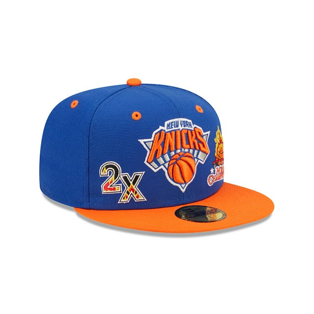 The New York Knicks Fire 59FIFTY Fitted Cap features an embroidered Knicks logo at the front panels between NBA Championship themed patches, and an NBA logo at the rear. Additional details include a green undervisor.
