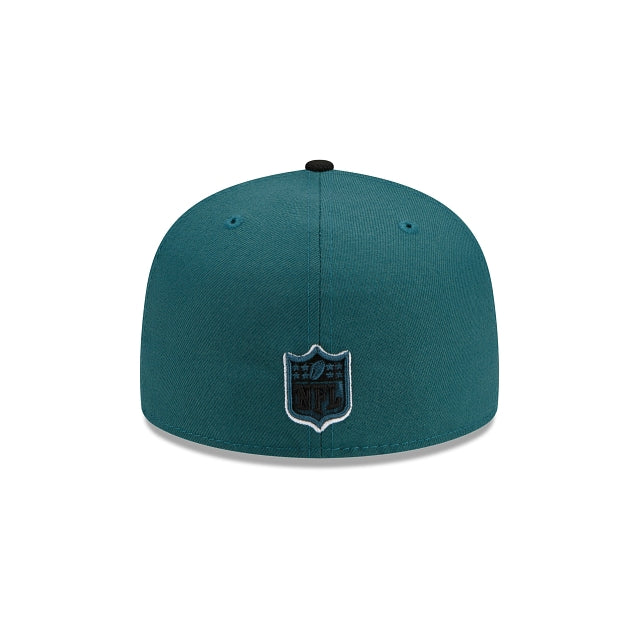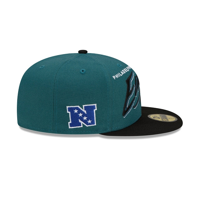 Rewind time with the Philadelphia Eagles Helmet 59FIFTY Fitted Cap featuring an embroidered Eagles script, complimented by a raised team helmet at the front panels with a division patch at the right-wear side and the NFL Shield at the rear.