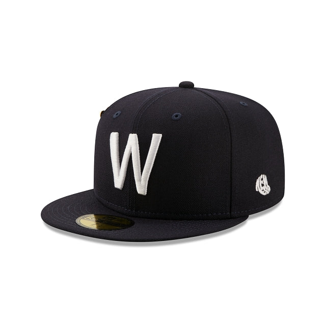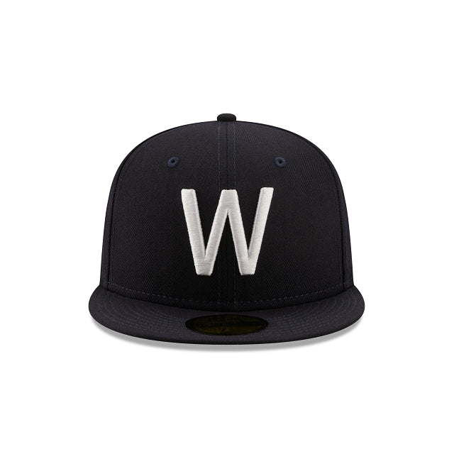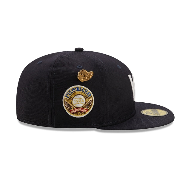 The Washington Senators 1924 Logo History 59FIFTY Fitted Cap features an embroidered Senators logo at the front panels, a 1924 World Series patch and New Era pin at the right-wear side, and a matching MLB Batterman logo at the rear. Additional details include a green undervisor.
