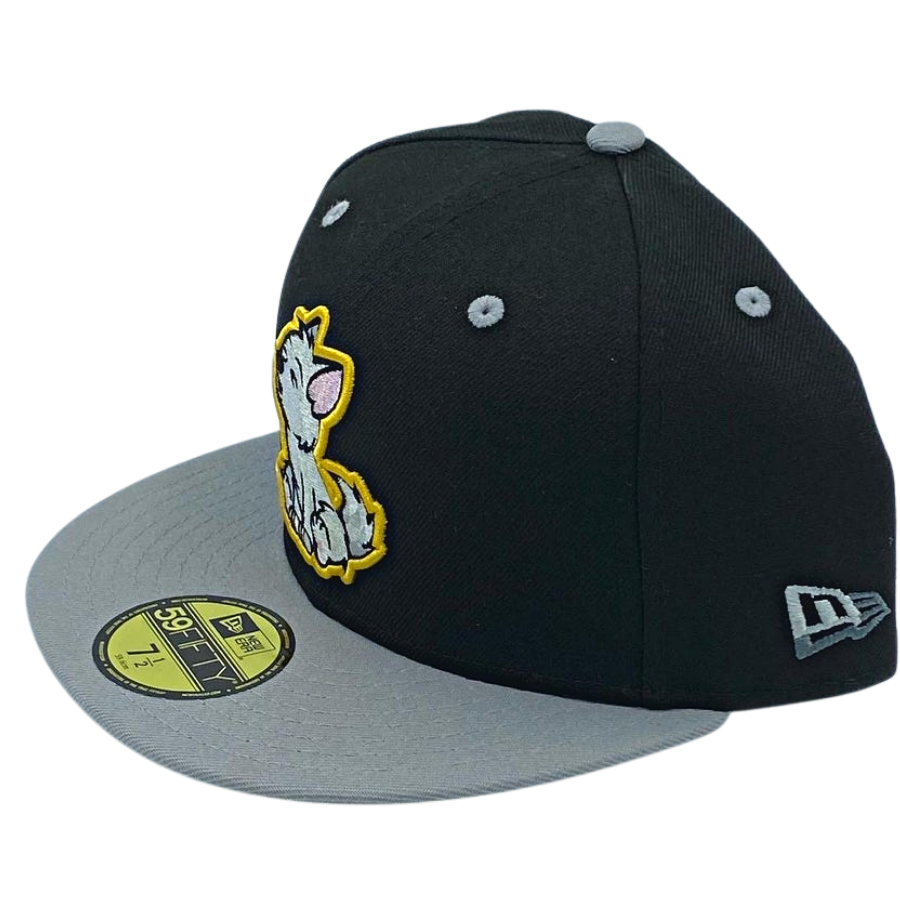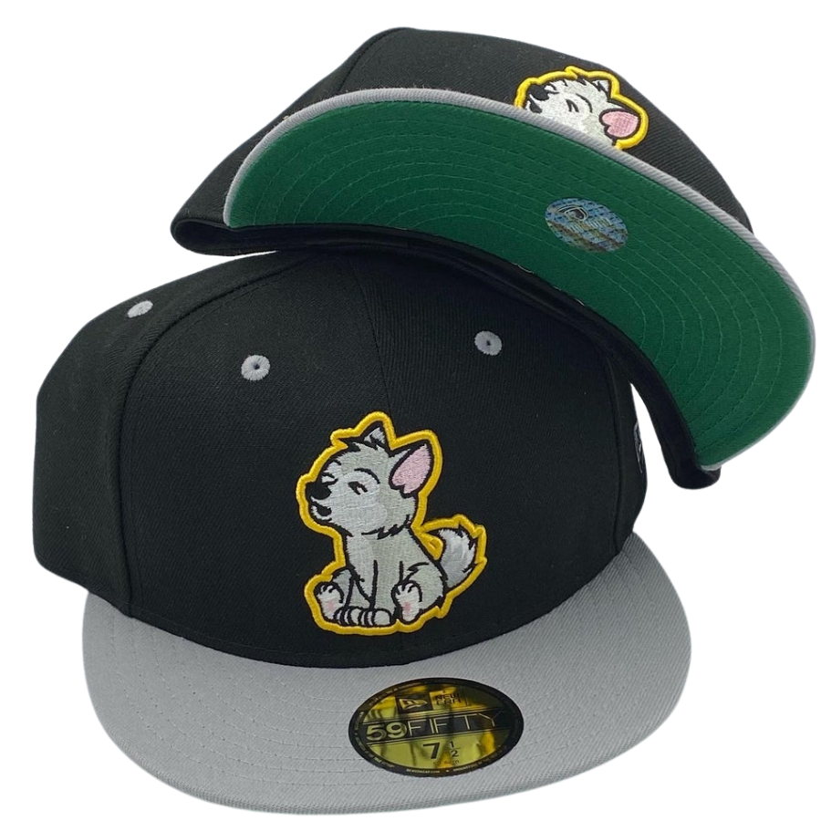 This New Era Wolf Cub fitted hat is a The Capologists exclusive release. The 59FIFTY fitted has a black six panel structured high crown with light grey embroidered eyelets, fabric squatchee button and flat bill. The undervisor of the fitted is kelly green with a black sweatband. The front panel features a a wolf cub embroidered in grey thread outlined in yellow.