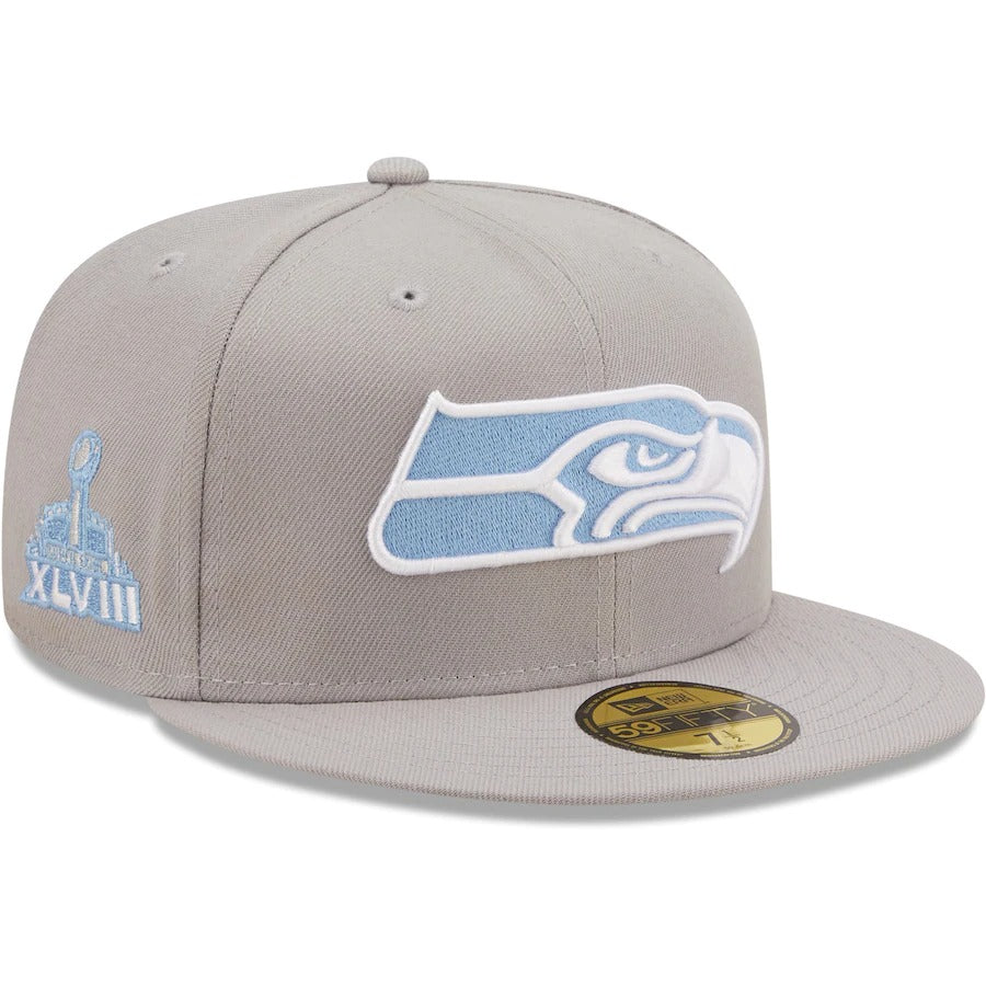 Fly your Seattle Seahawks flag high with this Super Bowl XLVIII Sky Blue Undervisor 59FIFTY hat. The bold embroidery on this New Era lid coordinates with the undervisor to add a streak of color to any outfit. This Seattle Seahawks hat will also provide a consistently comfortable wear thanks to its structured design and fitted construction.