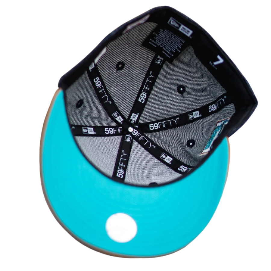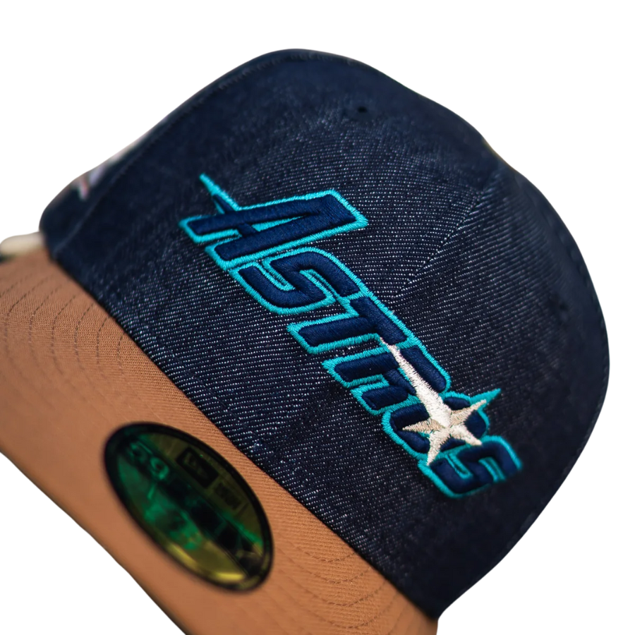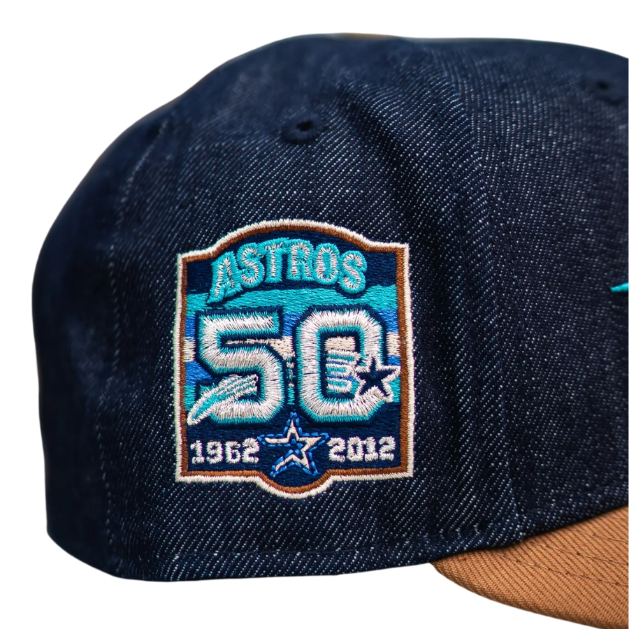 This New Era 59FIFTY Houston Astros fitted hat was released by Sneaker Town. The fitted has a denim six panel structured high crown and embroidered eyelets with a cream fabric squatchee button. The flat bill of the fitted is khaki with a teal undervisor and black sweatband. The front panel features the Houston Astros logo embroidery with a 50th Anniversary side patch on the right-wear side.
