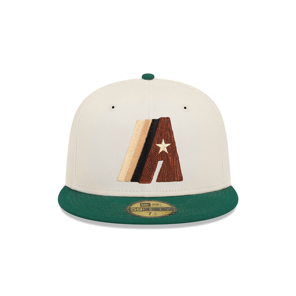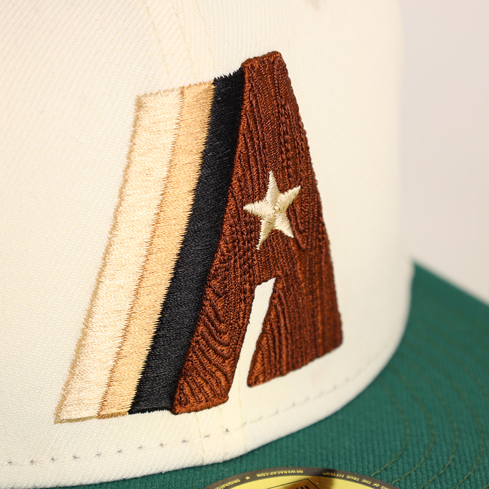 This Houston Astros 59FIFTY fitted hat was released by Crown Minded. The fitted has a chrome six panel structured high crown and embroidered eyelets with a green flat bill & fabric squatchee button. The fitted also has a grey bottom under bill with a black sweatband. The front panel features the Houston Astros logo embroidery with a matching chrome/green and brown side patch on the right panel. The left panel of the fitted displays the New Era logo and the official MLB Batterman embroidery on the rear crown.