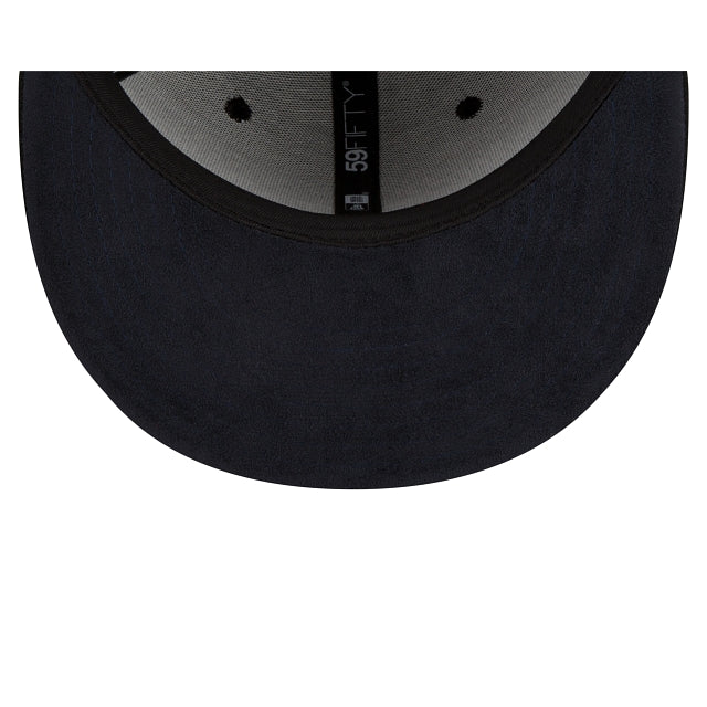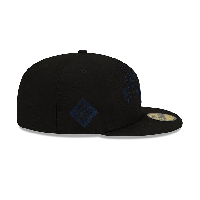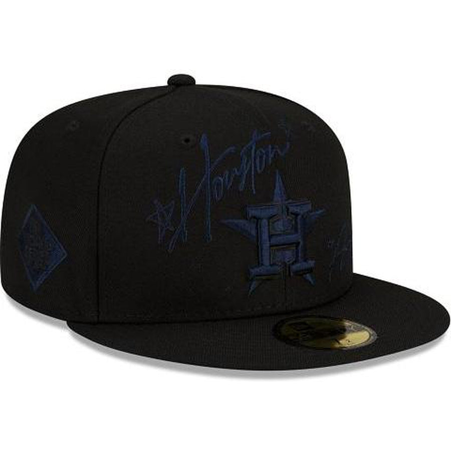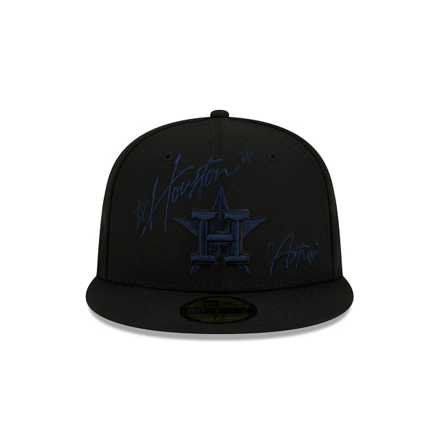 The Houston Astros Cursive 59FIFTY Fitted Cap features an embroidered Astros logo with a matching cursive script at the front panels, a World Series patch embroidered at the right-wear side and the MLB Batterman logo at the rear. Additional details include a gray undervisor.