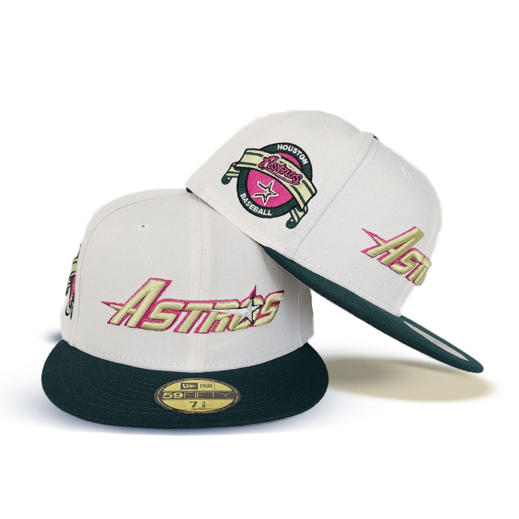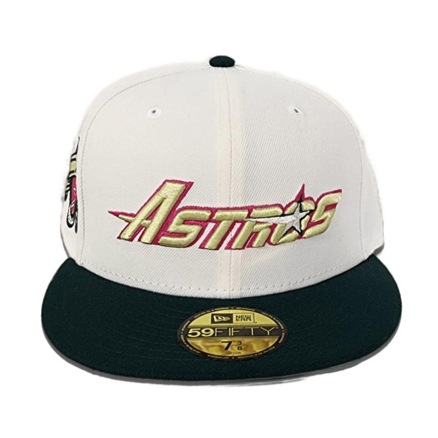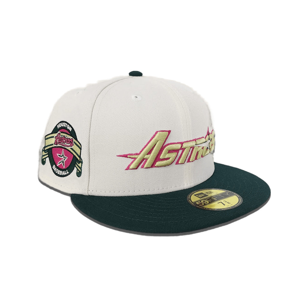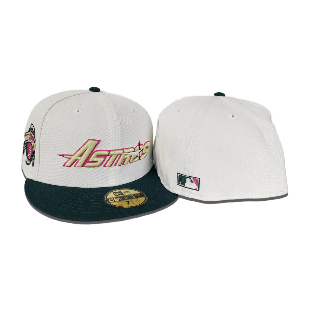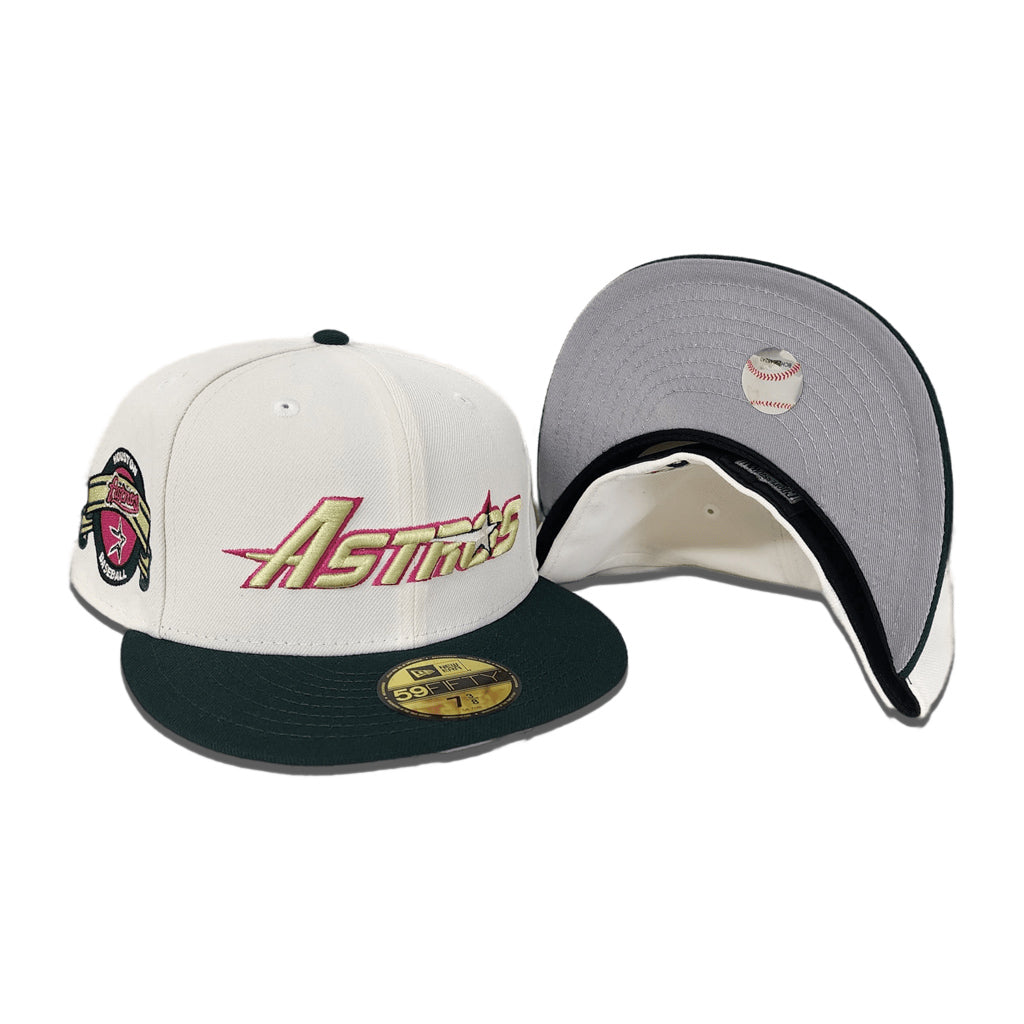 This Houston Astros 59FIFTY fitted hat was released by Exclusive Fitted. The fitted has an off-white six panel structured high crown and embroidered eyelets with a forest green flat brim and fabric squatchee button with a grey undervisor. The front panel features the Houston Astros logo embroidery with a side patch on the right panel. The left panel of the fitted displays the New Era logo and the official MLB Batterman embroidery on the rear crown.