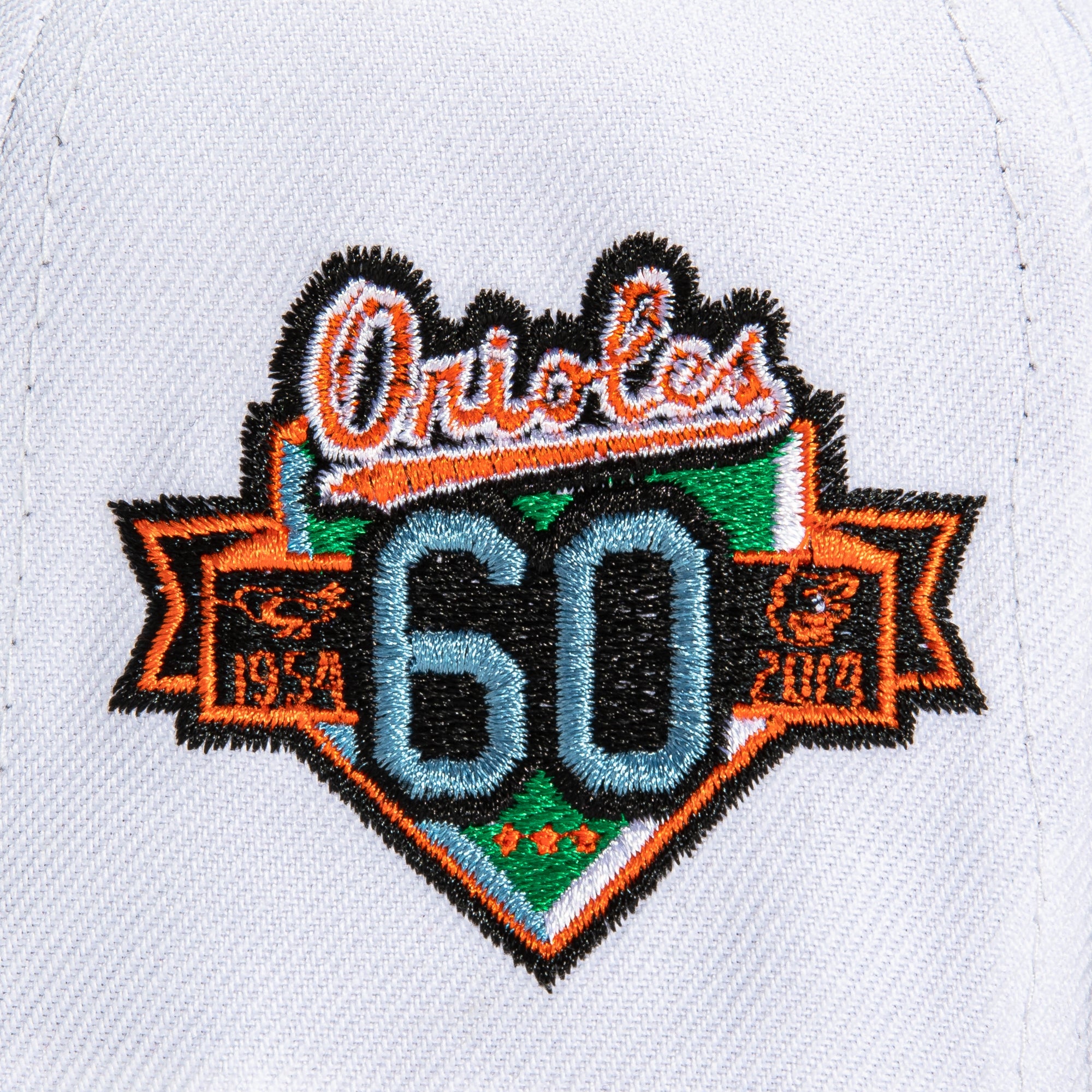 This New Era Baltimore Orioles 'Snowman' 60th Anniversary 2022 59FIFTY Fitted Hat was released by Hat Club. The fitted has a white six panel structured high crown and snowflake embroidered eyelets with a black fabric squatchee button. The flat bill of the fitted cap is also black with a light blue undervisor. The front panel features the Baltimore Orioles logo embroidery and a side patch embroidered on the right panel. The left panel of the fitted displays the New Era logo and the official MLB Batterman insignia embroidered on the rear crown. The fitted hat colorway is inspired by the colors of a snowman.
