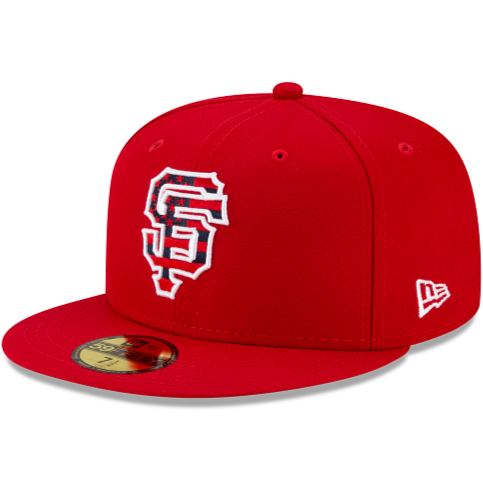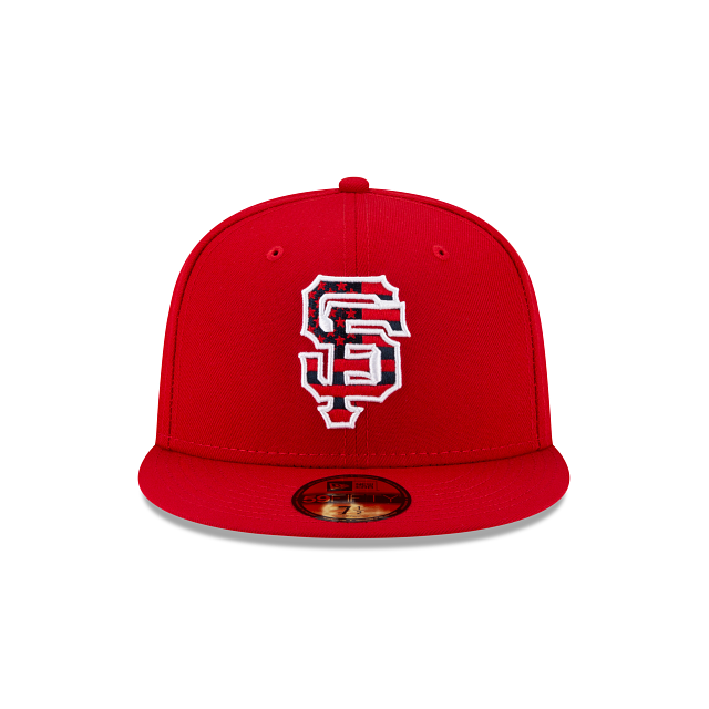Show your patriotism with the San Francisco Giants Independence Day 59FIFTY Fitted Cap featuring an intricate stars and stripes pattern embroidered within the Giants logo at the front panels with a city-specific logo embroidered at the right wear side and a matching MLB Batterman logo at the rear.