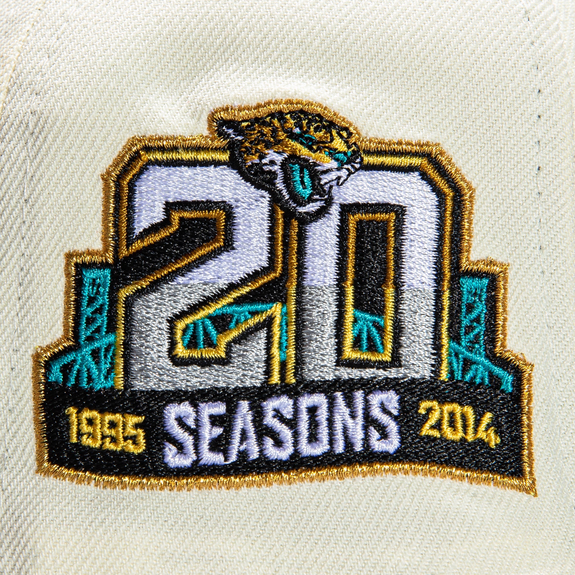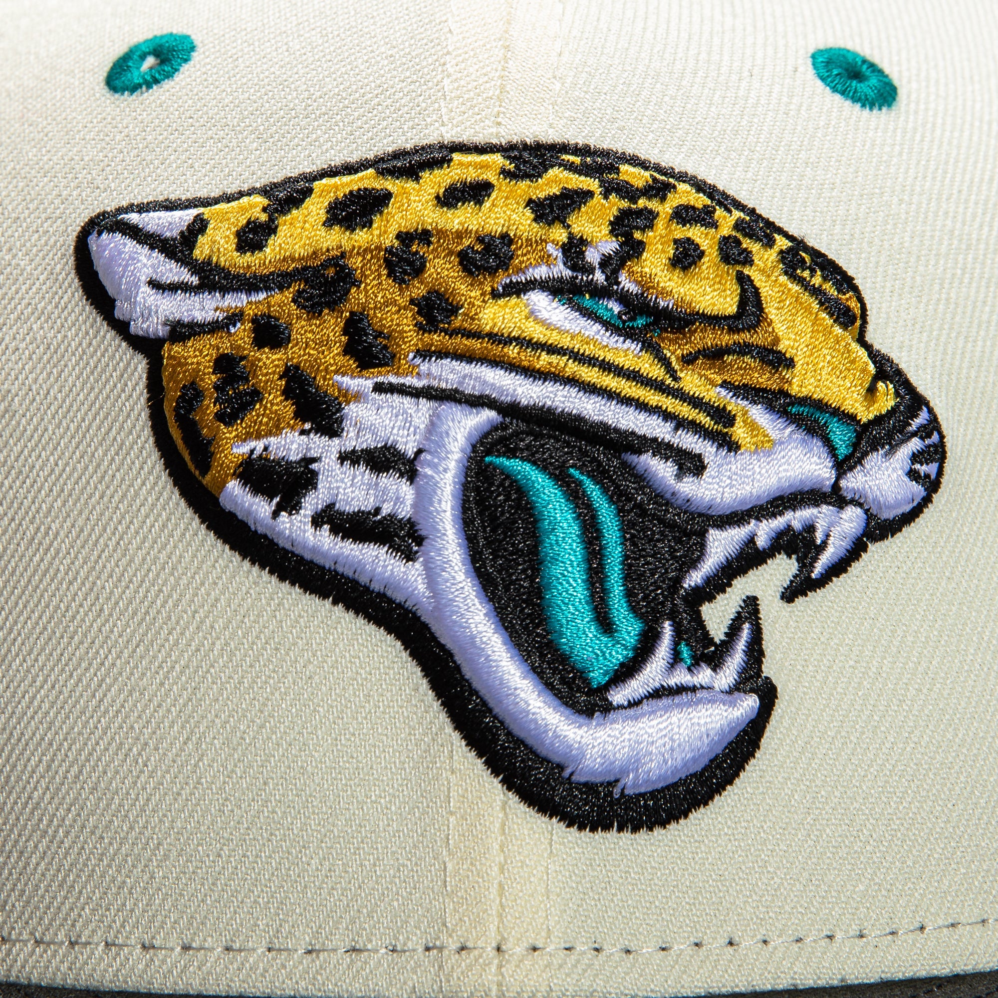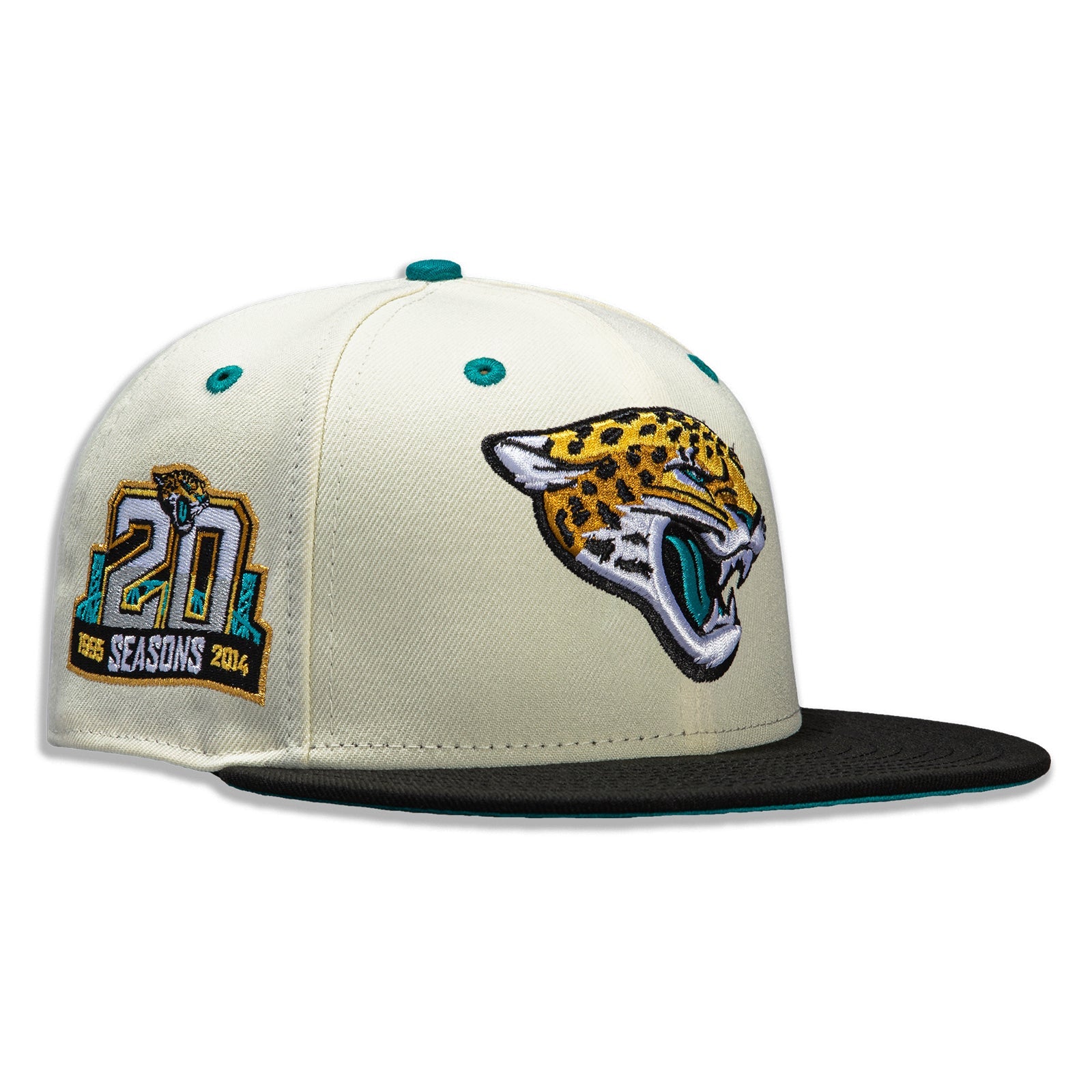 This New Era Tropics Jacksonville Jaguars 20th Anniversary 59FIFTY Fitted Hat is a Hat Club exclusive. The fitted has a white six panel structured high crown with teal embroidered eyelets and fabric squatchee button. The fitted cap has a black flat bill with a teal undervisor and black sweatband. The front panel features the Jacksonville Jaguars logo embroidery and a side patch embroidery on the right panel. The left panel of the fitted displays the New Era logo and the official MLB logo embroidery on the rear crown.