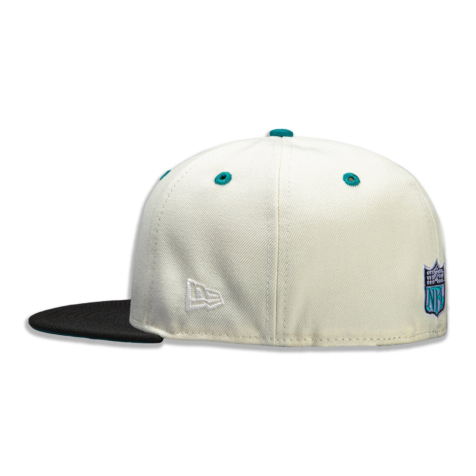 New Era 59Fifty Fitted Hat White Crown Black Visor Teal Undervisor Embroidered Team logo on front 20th Anniversary Patch Embroidered on Right Panel 100% Polyester