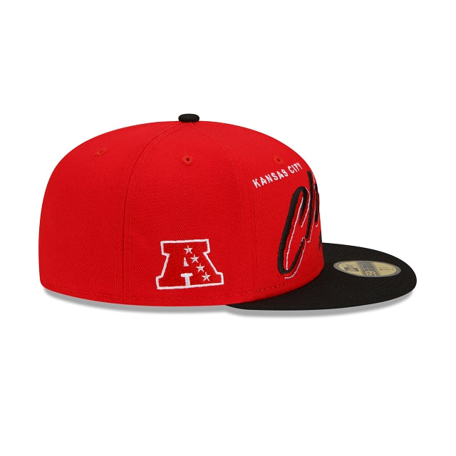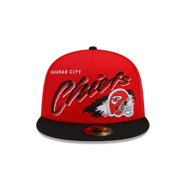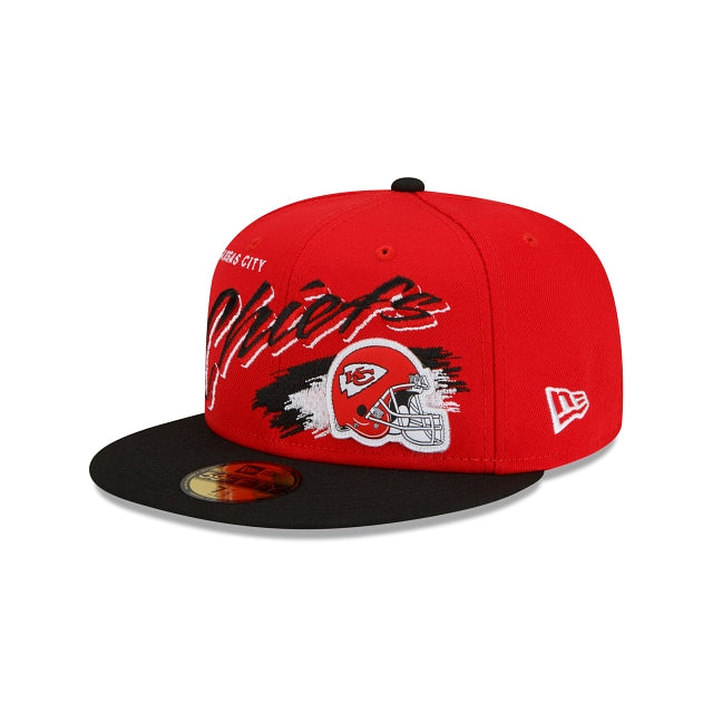 Rewind time with the Kansas City Chiefs Helmet 59FIFTY Fitted Cap featuring an embroidered Chiefs script, complimented by a raised team helmet at the front panels with a division patch at the right-wear side and the NFL Shield at the rear.