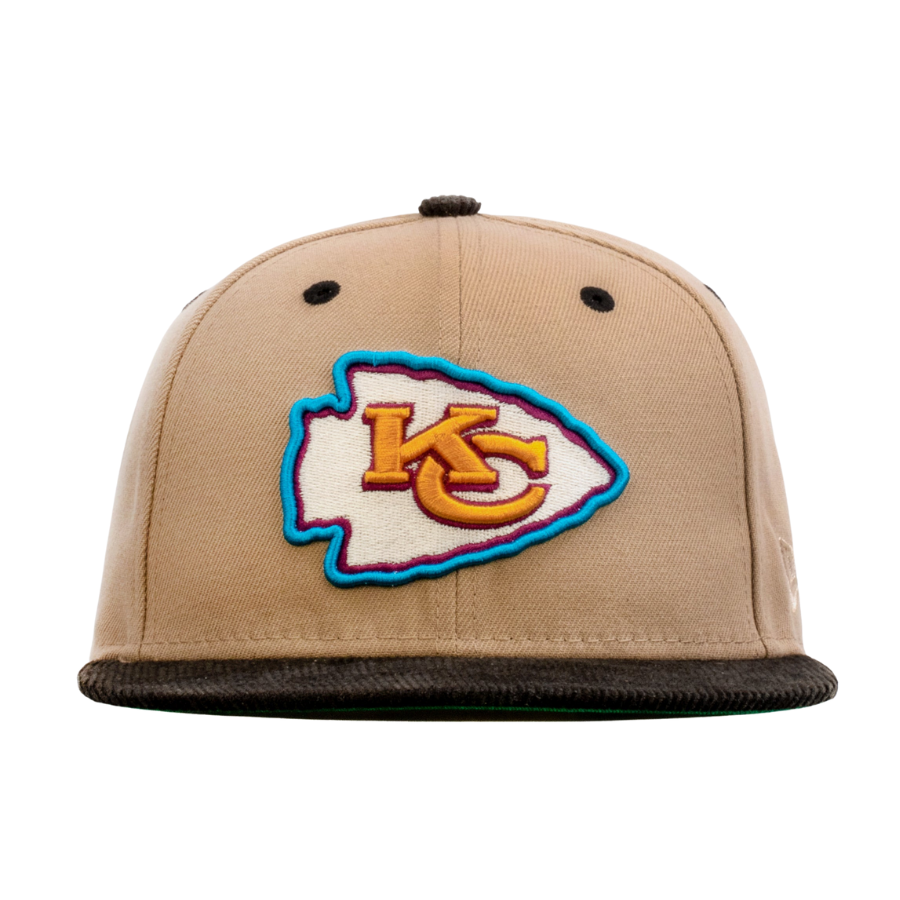 This New Era x SP 'Desert Sky' Kansas City Chiefs 2023 59FIFTY Fitted Hat was released by Shoe Palace. The fitted has a tan six panel structured high crown and black embroidered eyelets with a black fabric squatchee button. The flat bill of the fitted cap is also black corduroy with a green undervisor and white sweatband. The front panel features the Kansas City Chiefs logo embroidery. The left panel of the fitted displays the New Era logo and the NFL shield and desert cactus embroidered on the rear crown.