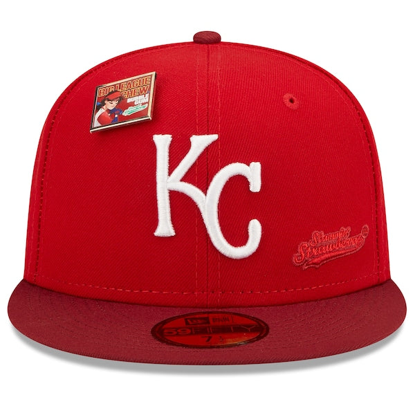 The MLB and Big League Chew have teamed up to bring Kansas City Royals fans this one of a kind, Slammin' Strawberry Flavor Pack 59FIFTY Fitted Hat. Featuring a high crown and flat bill, this New Era hat will take your game day look to the next level. Its classic and fun graphics combine your Kansas City Royals and your all-time favorite Big League Chew flavor, making it unlike anything else in your collection.