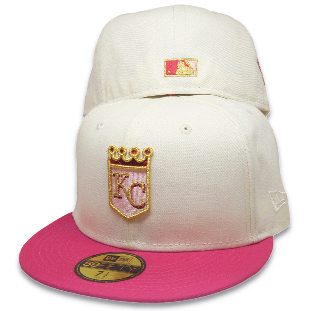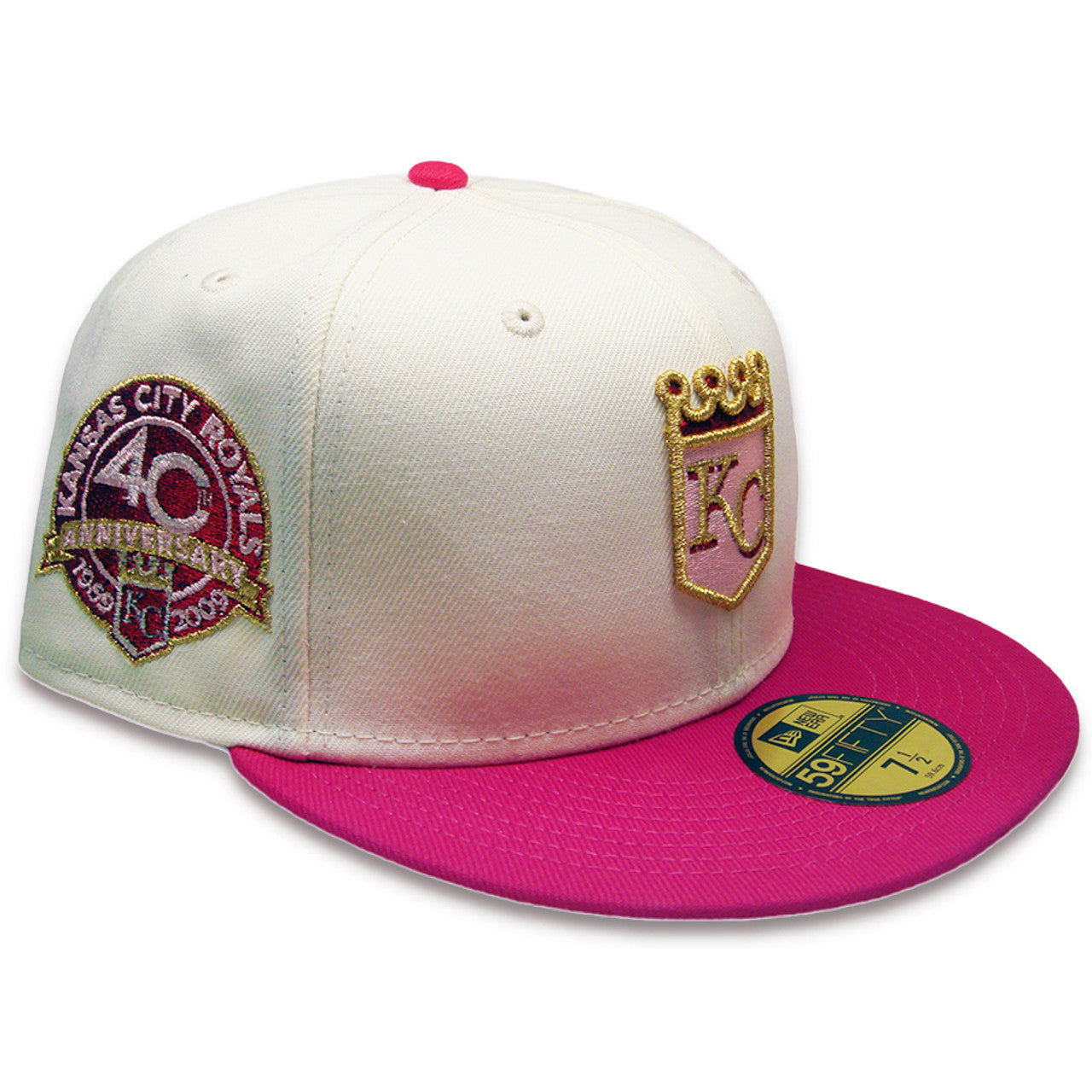 This Kansas City Royals 59FIFTY fitted hat was released by Ecapsunlimited. The fitted has a cream six panel structured high crown and embroidered eyelets with a hot pink fabric squatchee button. The fitted cap also has a hot pink flat bill with a green undervisor and white sweatband. The front panel features a gold embroidered Kansas City Royals logo and a 40th Anniversary side patch embroidery on the right panel. The left panel of the fitted displays the New Era logo and the official MLB batterman logo embroidery on the rear crown.