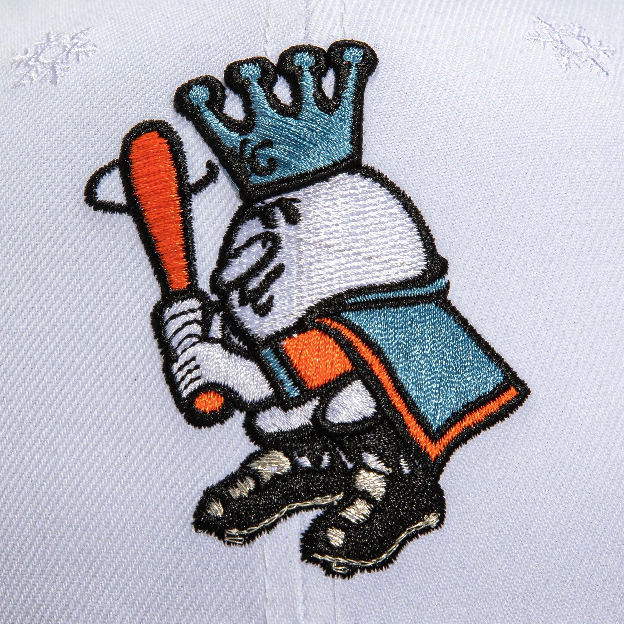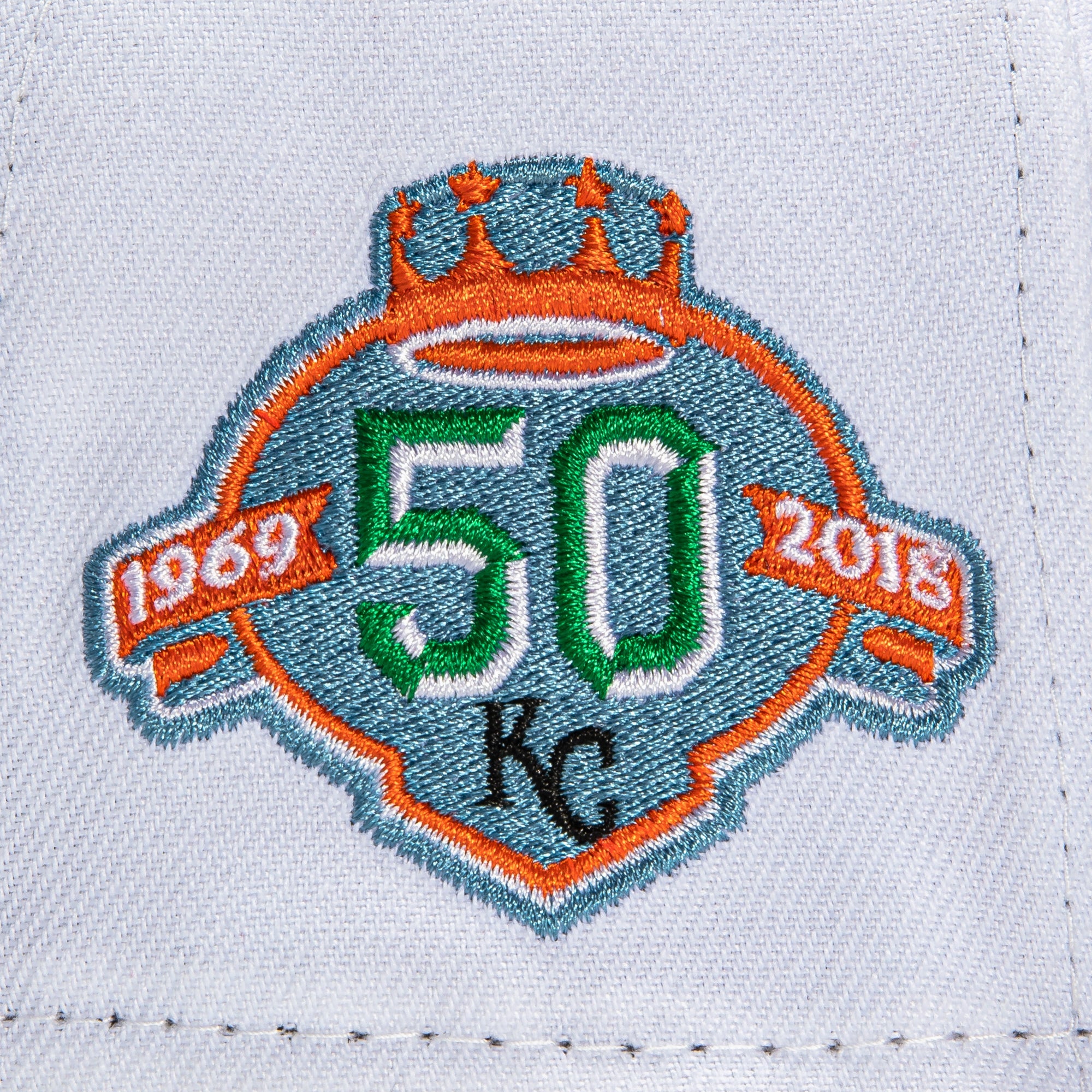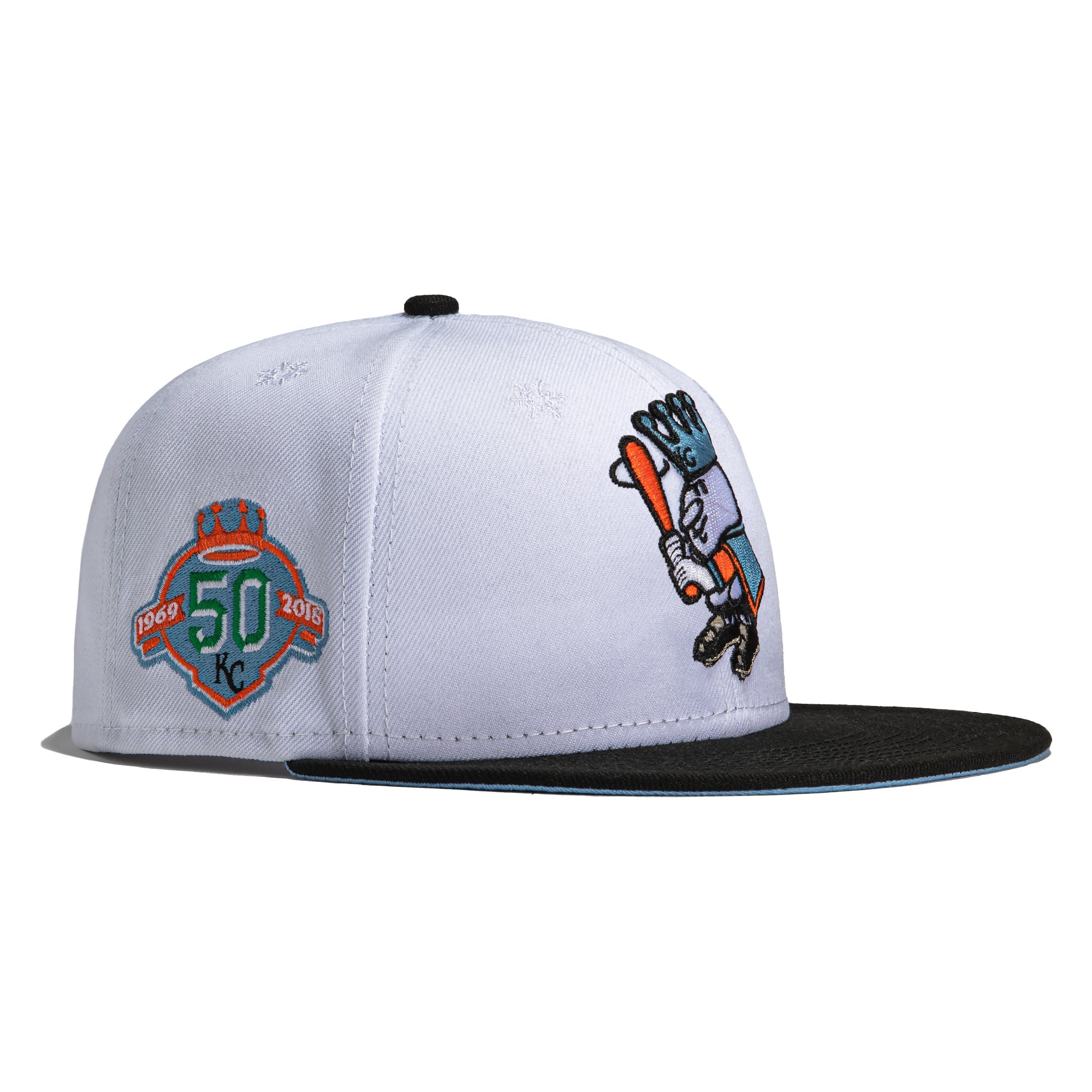 This New Era Kansas City Royals 'Snowman' 50th Anniversary 2022 59FIFTY Fitted Hat was released by Hat Club. The fitted has a white six panel structured high crown and snowflake embroidered eyelets with a black fabric squatchee button. The flat bill of the fitted cap is also black with a light blue undervisor. The front panel features the Kansas City Royals logo embroidery and a side patch embroidered on the right panel. The left panel of the fitted displays the New Era logo and the official MLB Batterman insignia embroidered on the rear crown. The fitted hat colorway is inspired by the colors of a snowman.