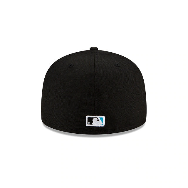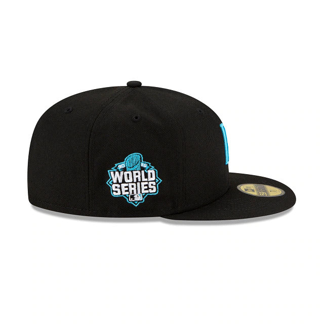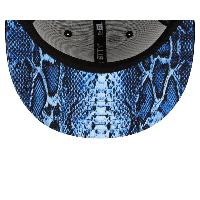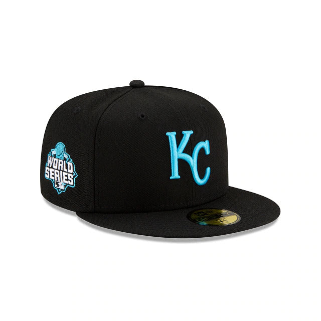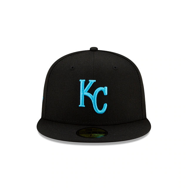 The Kansas City Royals Summer Pop 59FIFTY Fitted Cap features a neon Royals logo embroidered at the front panels with a World Series patch at the right-wear side and a matching MLB Batterman logo at the rear. Additional details include a snakeskin print undervisor.