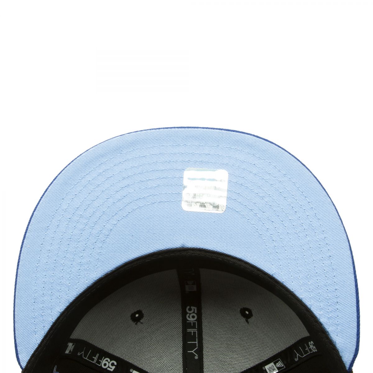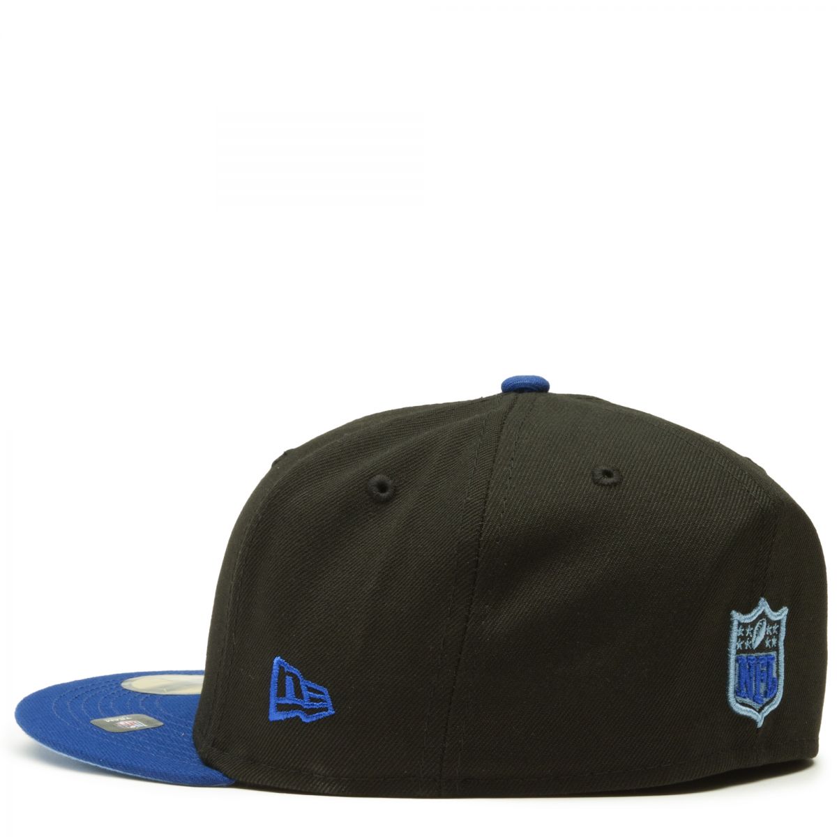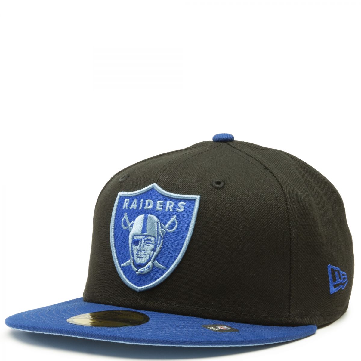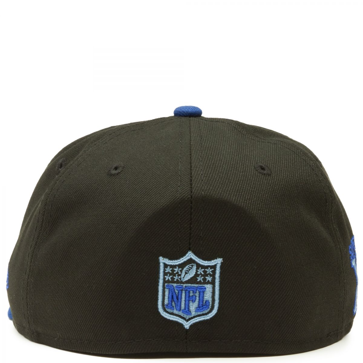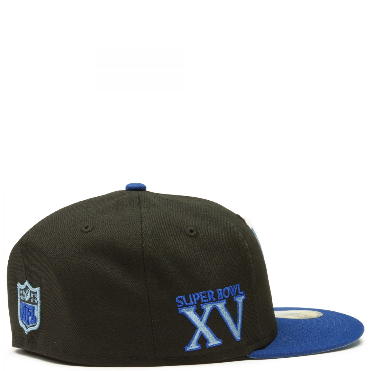 This New Era Las Vegas Raiders Black/Royal Super Bowl XV 59FIFTY Fitted Hat has a black six panel structured high crown and embroidered eyelets with a royal blue fabric squatchee button. The fitted cap has a royal blue flat bill with a sky blue undervisor. The front panel features the Las Vegas Raiders logo embroidery and a side patch embroidery on the right panel. The left panel of the fitted displays the New Era logo and the official NFL logo embroidery on the rear crown.