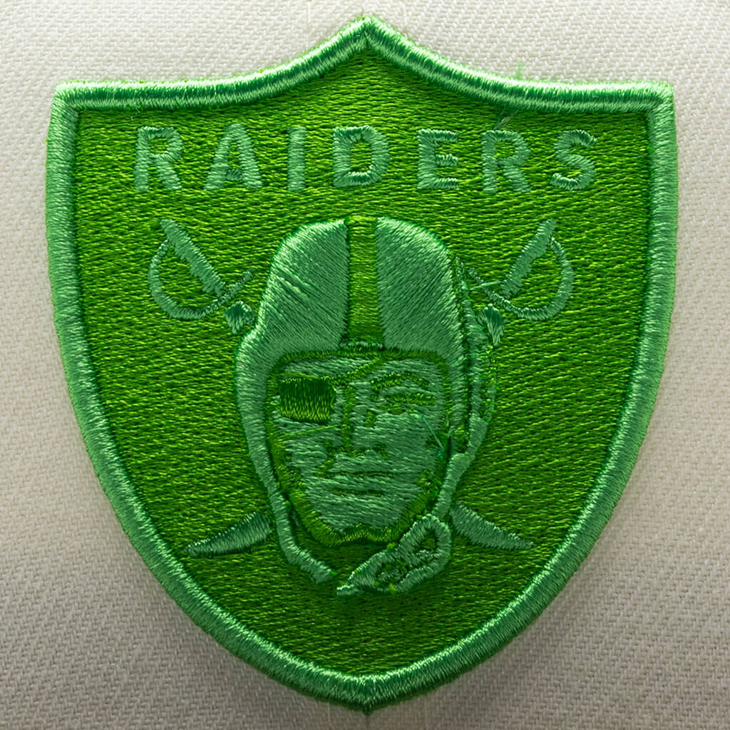 This New Era x Feature Las Vegas Raiders Bamboo 2023 59FIFTY Fitted Hat was released by Feature. The fitted has a chrome/white six panel structured high crown, dark brown embroidered eyelets & fabric squatchee button. The flat bill of the fitted cap is also dark brown with a lime green bottom undervisor with a white sweatband. The front panel features the Las Vegas Raiders logo embroidered in lime stitching with a side patch on the right panel in the same lime colorway. The left panel of the fitted displays the New Era logo and the official MLB Batterman on the rear-crown .
