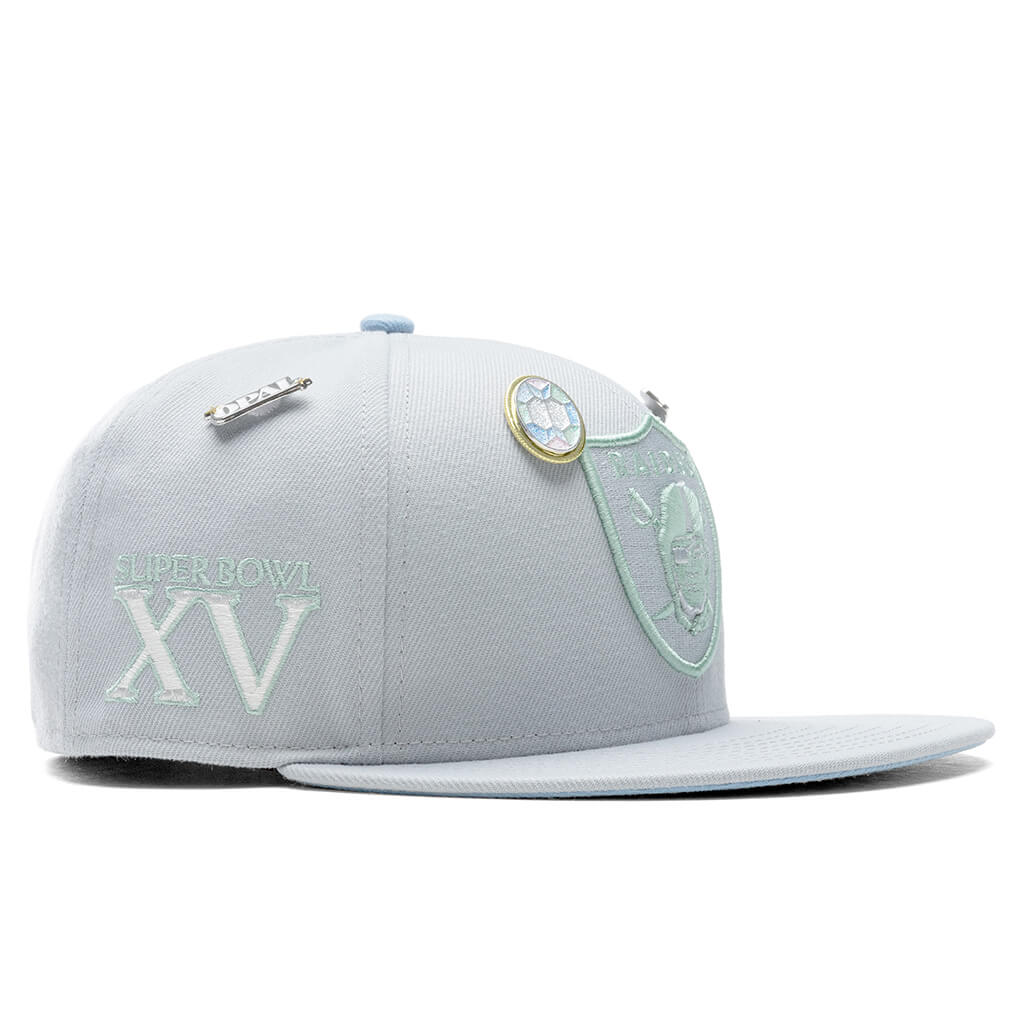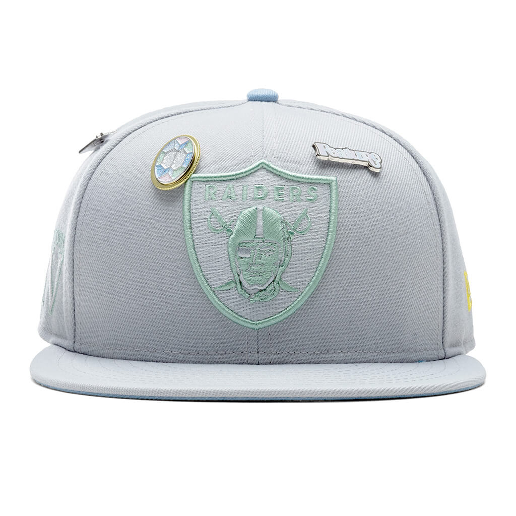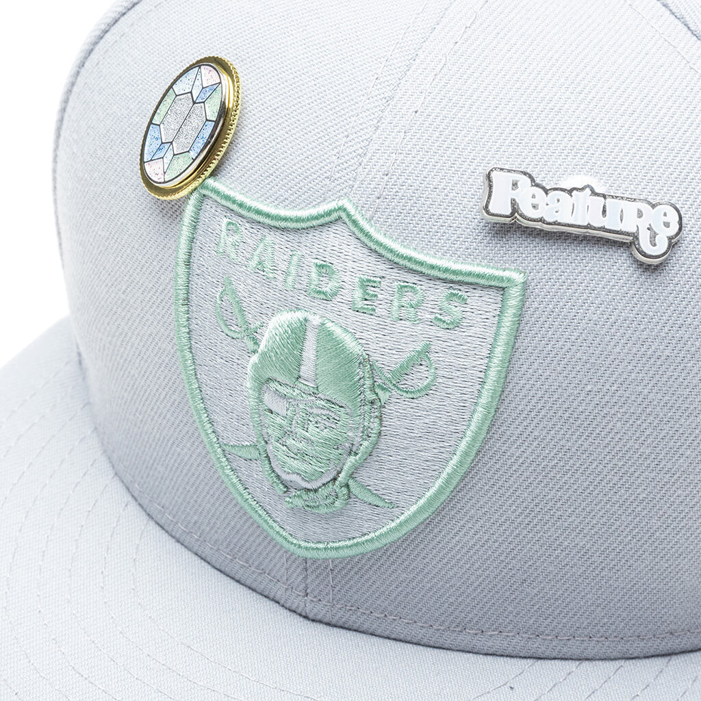 This New Era x Feature Las Vegas Raiders "Opal" 59FIFTY Fitted Hat has a light grey six panel structured high crown and embroidered eyelets with a sky blue fabric squatchee button. The fitted cap has a light grey flat bill with a sky blue undervisor and white sweatband. The front panel features the Las Vegas Raiders logo embroidery. The left panel of the fitted displays the New Era logo and the official NFL logo embroidery on the rear crown.
