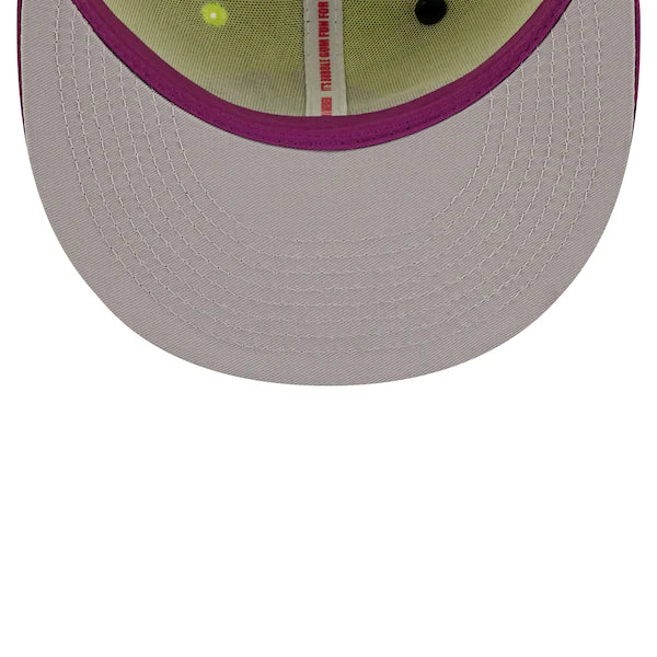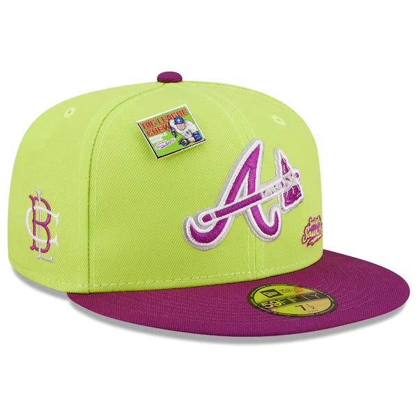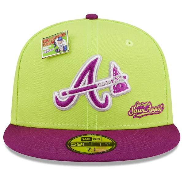 The MLB and Big League Chew have teamed up to bring Atlanta Braves fans this one of a kind, Swingin' Sour Apple Flavor Pack 59FIFTY Fitted Hat. Featuring a high crown and flat bill, this New Era hat will take your game day look to the next level. Its classic and fun graphics combine your Atlanta Braves and your all-time favorite Big League Chew flavor, making it unlike anything else in your collection.